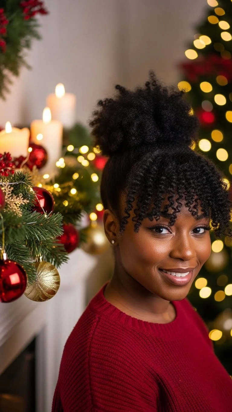 Afro puff bangs add a playful twist to a classic puff. Start by sectioning off the front. Pin it aside. Secure the rest of your hair into a puff. Fluff it gently for shape. Bring the front curls forward and trim lightly if needed. Use a bit of curl cream to define the bangs. Keep it light so the curls stay soft. Add pearl pins or a red bow on the side for a holiday vibe. If your bangs are short, use a small clip-in piece for volume. Maintain the puff with daily hydration. This look feels warm and friendly, perfect for gatherings.