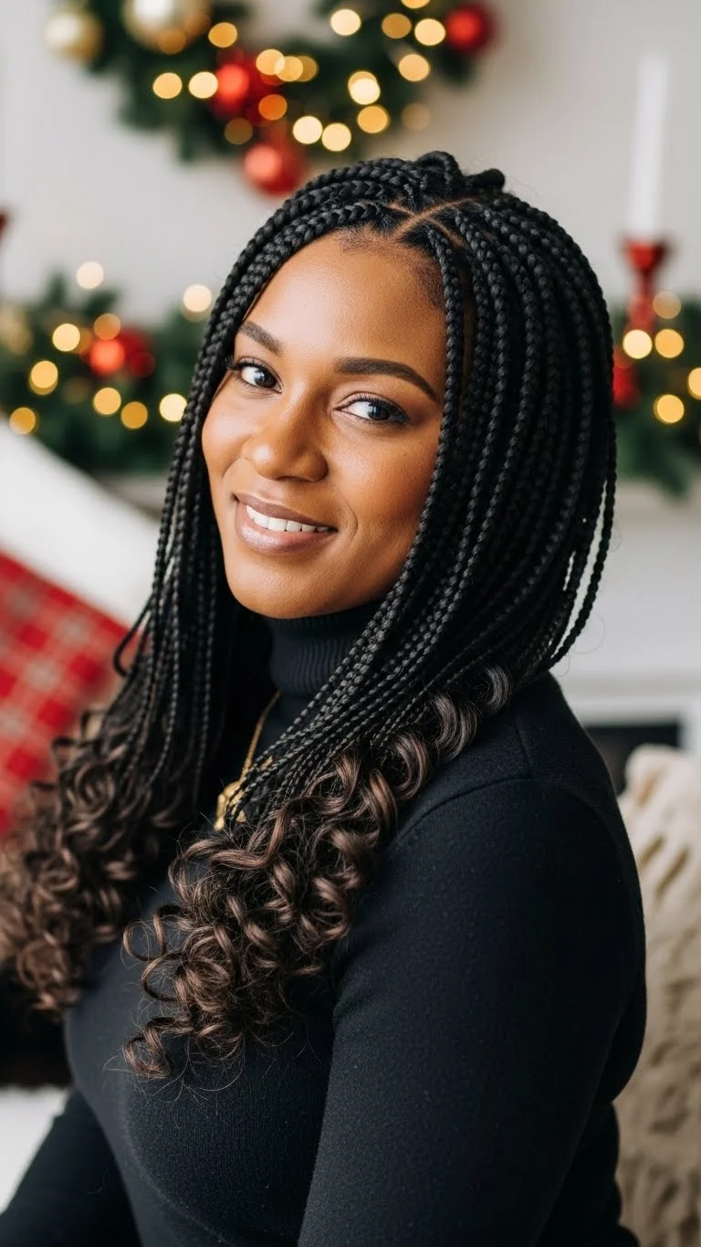 Goddess braids mix structure with softness. Create medium knotless braids but leave some pieces curly. Use a few packs of curly hair so the look remains light. Add mousse to blend the curls. Place gold clips randomly to add a subtle holiday shine. This style lasts a while, making it great for the entire season. Keep the curls fresh with a light leave-in spray. Avoid heavy oils so the curls don’t clump. This style looks great with both casual and dressy outfits.