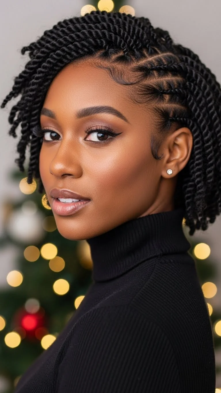 Jumbo twists offer a bold shape that works for any holiday event. They’re fast to install and easy to maintain. Use medium to large sections for quicker twisting. Add a little twisting cream for slip so the twists stay neat. Decorate the ends with holiday beads. Choose lightweight ones so the twists don’t feel heavy. You can find full packs for a low price. Attach them using clear rubber bands if they don’t stay in place. If your hair is shorter, add braiding hair for length. One pack is often enough for jumbo twists. Keep the twists moisturized with a light spray mix of water and oil. This prevents dryness during cold weather. The style lasts long and still looks fresh with simple touch-ups. Wear the twists down, half-up, or in a bun depending on your outfit. The beads add a festive shimmer that shows well in photos. This look is perfect for casual gatherings or dressy nights.