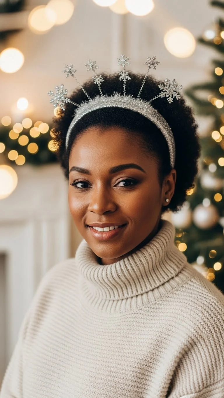 A sparkly headband adds instant holiday energy to your afro. Fluff your hair with a pick or your hands. Choose a headband that fits comfortably. Many affordable ones are sold during December. Slide it gently so it doesn’t snag curls. Use a small amount of oil for shine. Keep the product light. This look is fast, cute, and works for all lengths. It pairs well with any outfit from casual to dressy.