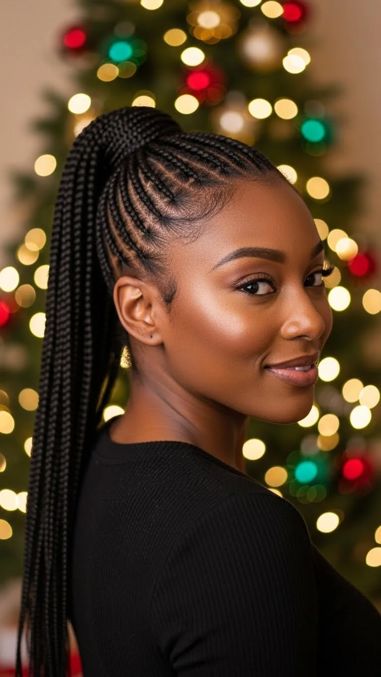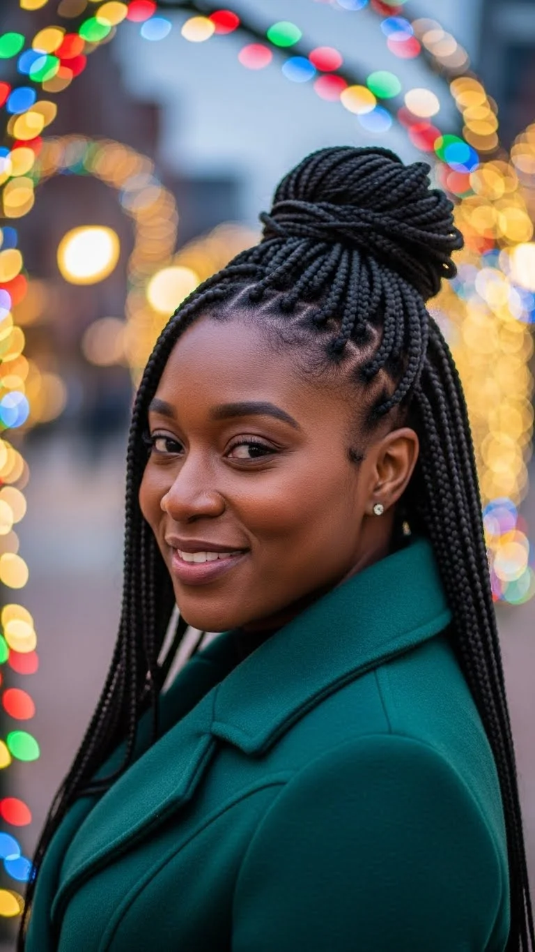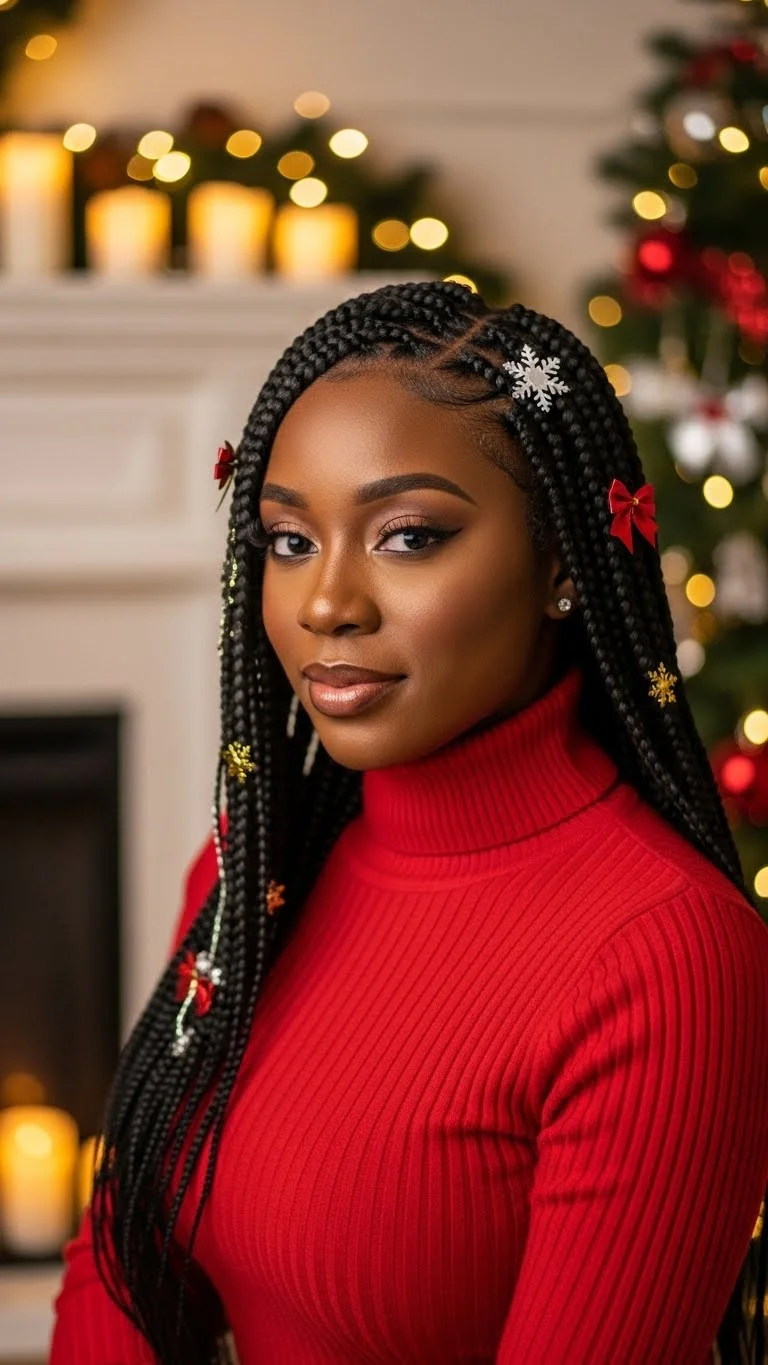 Knotless braids are comfortable and stylish for the season. Pull the top half into a bun for a fun holiday twist. Keep the bun loose to avoid tension. Add gold strings or rings to a few braids for a warm glow. You can do this at home without salon costs. The strings are cheap and easy to wrap. Leave the bottom braids flowing for movement. Use mousse to smooth flyaways. This look works for long and medium-length braids. If your braids are shorter, create two buns instead of one. It looks just as cute. Refresh your scalp with a simple spray mix of water, a drop of oil, and a little leave-in conditioner. This keeps the style feeling light and clean. Wear this look for Christmas markets, brunch outings, or casual parties.