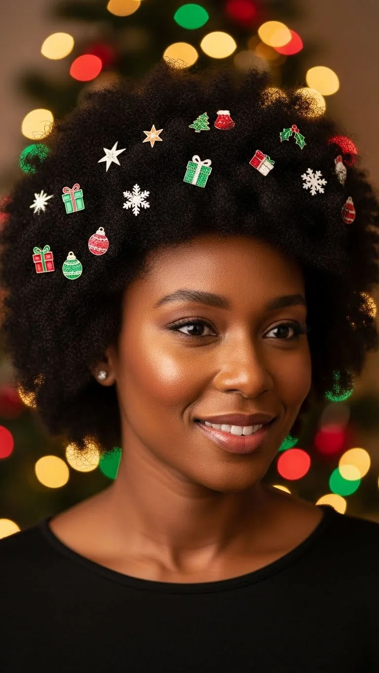 A voluminous afro always draws warm attention during the holidays. Start with stretched hair for easier shaping. Use a wide pick to lift the roots. Work in small sections so your shape stays balanced. Add holiday pins at the sides or scattered throughout. Choose small pins so they don’t weigh the hair down. You can find cute options for a few dollars at beauty shops. Add light oil for shine. Keep the product amount small so the hair stays fluffy. If you want more fullness, separate a twist-out or braid-out. The more you separate, the bigger it gets. This style looks great with bold earrings or a simple sweater because the hair stands out on its own. If your afro is shorter, use mini puffs to create the same effect. Add one or two pins to each puff for a festive touch. The look is easy to refresh daily with gentle picking. Try sleeping with a loose pineapple to keep your shape. This style feels warm, soft, and full of personality, perfect for holiday dinners or cozy photos.