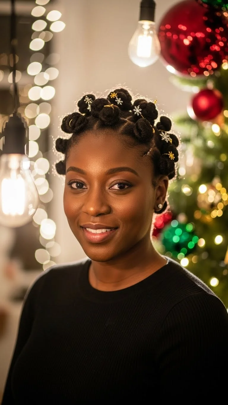 Bantu knots create a bold style that always stands out. Start with clean, stretched hair. Part the sections neatly so the style looks sharp. Add a little cream for moisture before twisting each knot. Roll the twist around itself and tuck the end under. Use small pins if needed. You don’t need many products. A basic gel and cream work fine. Add metallic cuffs at the base for a subtle holiday touch. If your scalp shows, apply a bit of oil for shine. This style also gives a great knot-out when taken down. You can switch your look midweek without extra cost. Keep the knots covered at night with a satin bonnet so they stay neat. This style works for all lengths. Short hair creates smaller knots that look just as cute. It’s a playful option for Christmas dances, outings, or cozy home gatherings.