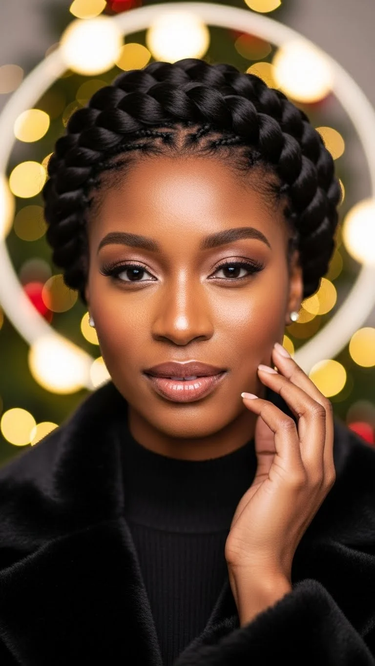 A braided crown looks soft and festive for holiday gatherings. Start with stretched hair so your braids sit smoothly. Create two medium braids and wrap them around your head. Pin them gently so they lay flat. Use a lightweight gel only on the front to smooth edges. Add pearl or gold pins along the braid for holiday sparkle. You don’t need many for a pretty effect. This style works for medium to long hair. If your hair is shorter, use braiding hair for fullness. Match the shade so the braid blends well. This style stays neat for hours, even in winter air. Wrap a scarf around the front for ten minutes to set the look before heading out. It’s perfect for dinners, church events, and Christmas parties.