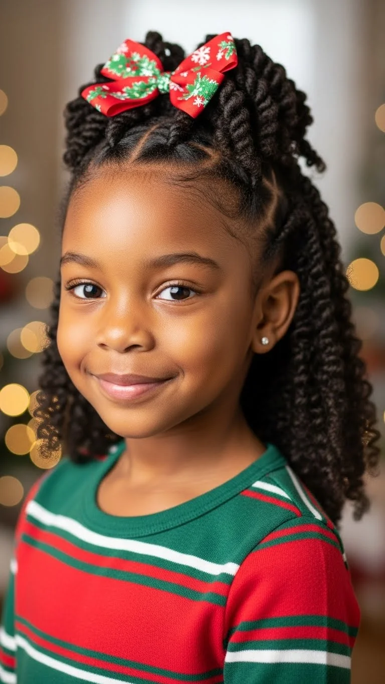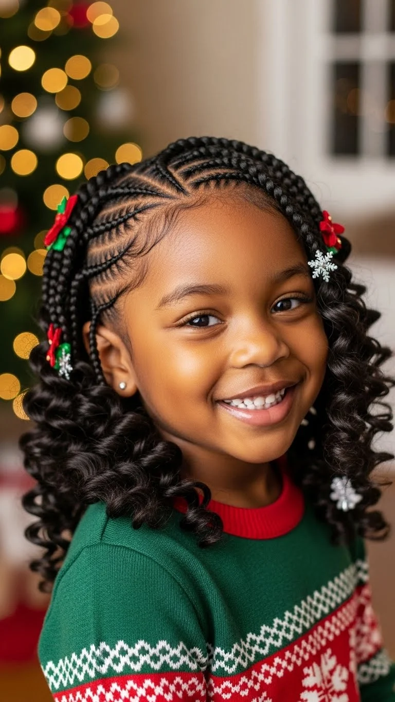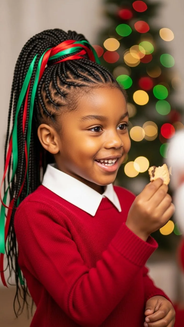 This style blends neat cornrows and a playful ponytail. Braid the rows upward toward the crown. Gather the ends into a high ponytail. Wrap holiday ribbons around the base. Let the curls or ends fall naturally. This look stays neat and practical for active kids. It’s great for school plays or Christmas events. Parents can finish it in under an hour if braiding is familiar. A little oil spray adds shine. The ribbons bring color and fun without adding weight. It’s a nice balance of tidy and festive.