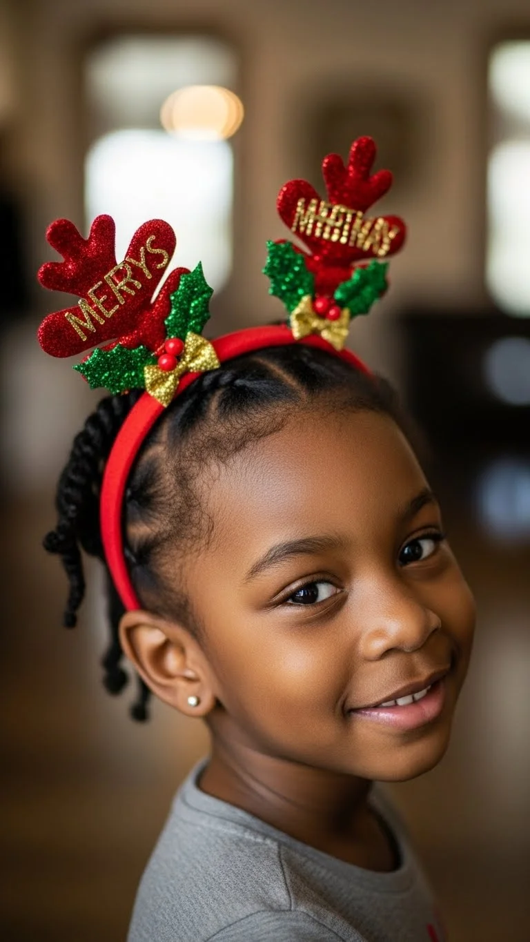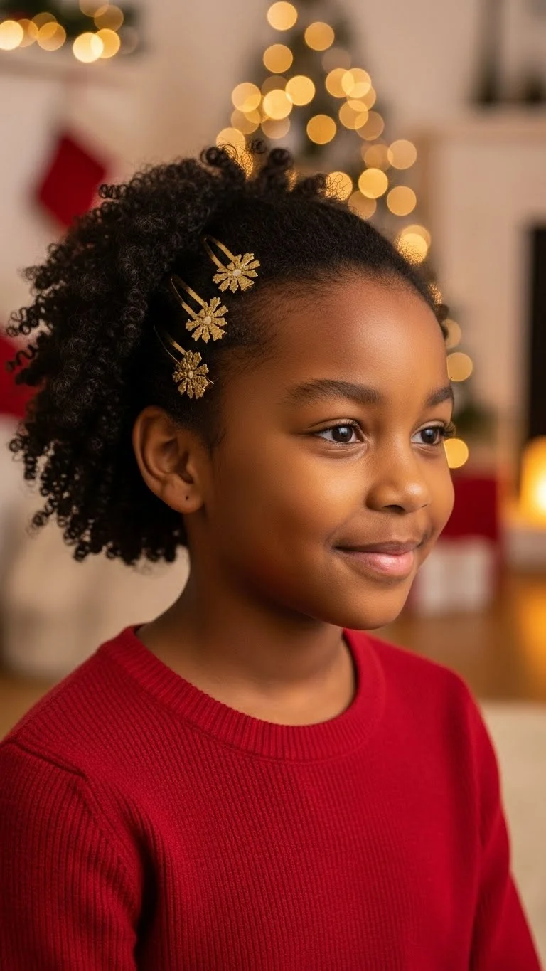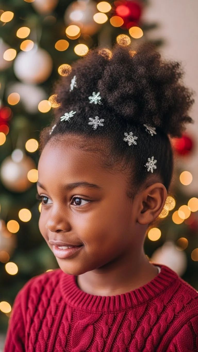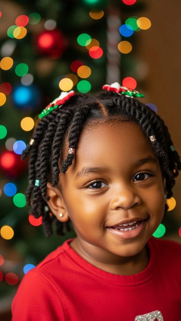 Mini twists are great for low-maintenance days. They’re easy, lightweight, and long-lasting. After moisturizing, divide the hair into small sections and twist each one down. Add holiday clips like snowflakes, stars, or metallic beads. Kids can choose their favorite colors, making it fun. The twists work well for active days since they resist frizz. They also take less time to refresh. Parents can let the child wear a satin bonnet at night to make the style last all week. The accessories add a seasonal touch without making the style heavy. It’s a great option if you want something that photographs well and still feels simple.
