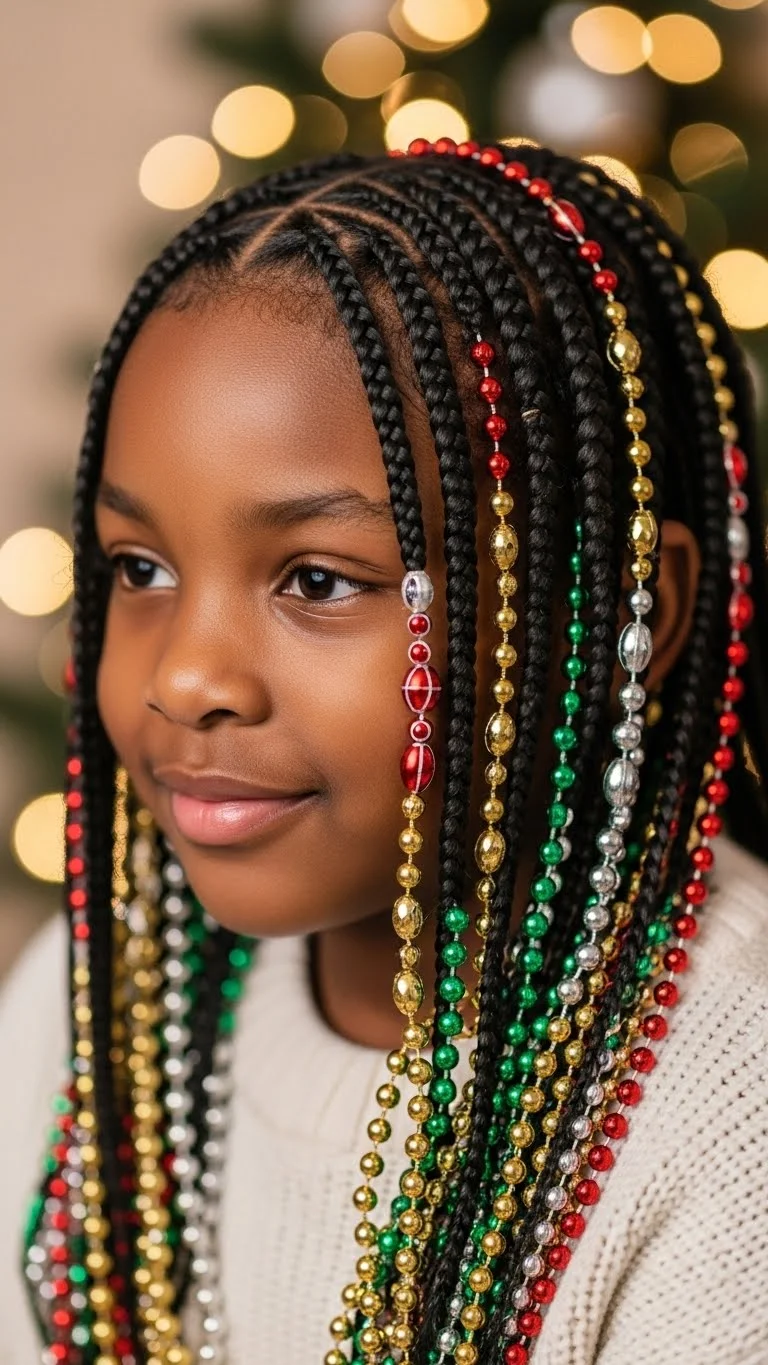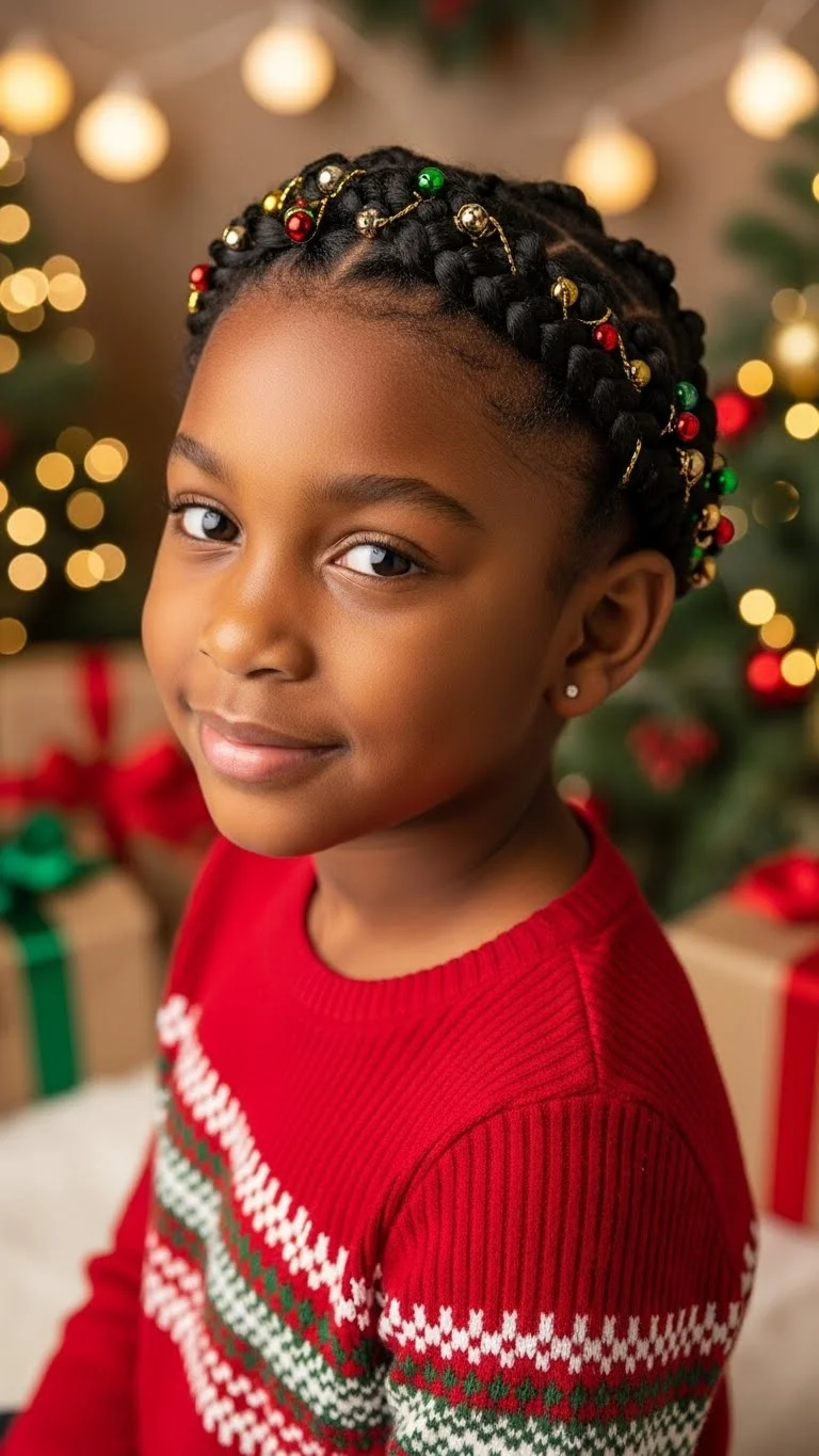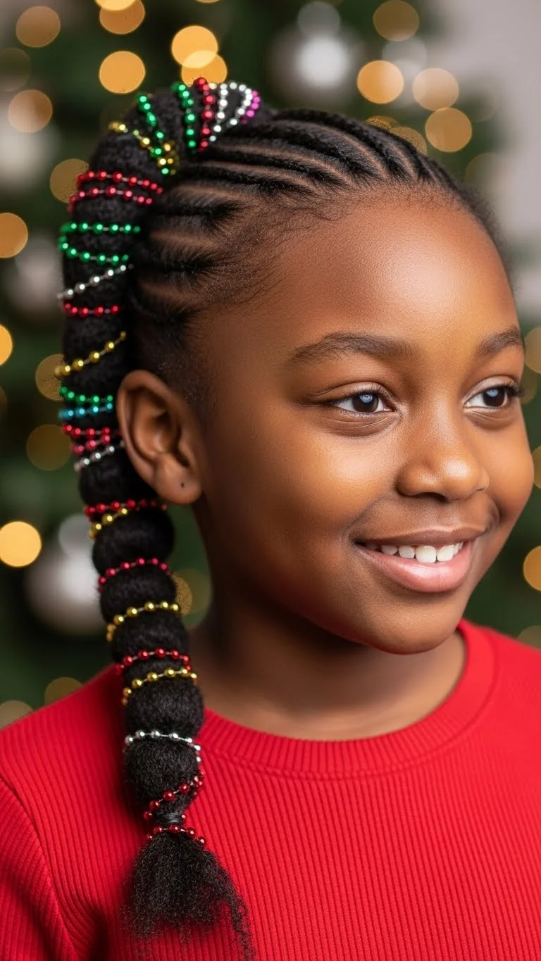 Cornrows swept to one side offer a stylish twist on a classic look. Part the hair diagonally and braid each row toward the same direction. Leave a few inches at the end for beads. Choose beads with Christmas colors like gold and red. This style stays neat for a week or more. Parents who prefer quick morning routines appreciate this option. It’s comfortable for kids and works well with scarves or earmuffs. Add a small holiday clip above the ear for fun. It frames the face nicely and looks great in photos. No heavy products needed—just moisturizer and a little gel for the front.