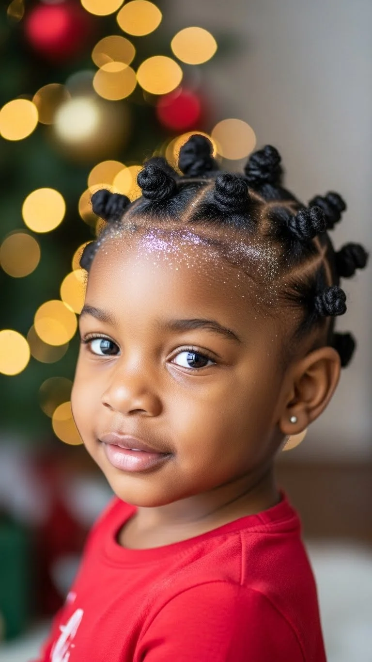 Bantu knots are stylish and easy to maintain. Part the hair into medium sections and twist each one into a knot. Secure with clips or hair ties. Add a touch of glitter gel along the hairline for a holiday shimmer. Keep the gel minimal so it stays gentle. The knots last several days with careful covering at night. Parents like that the style stays neat with little upkeep. Kids enjoy the cute shape and shine. You can add small holiday clips between the knots for extra color.