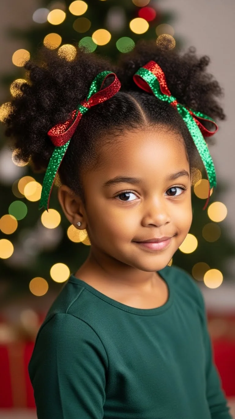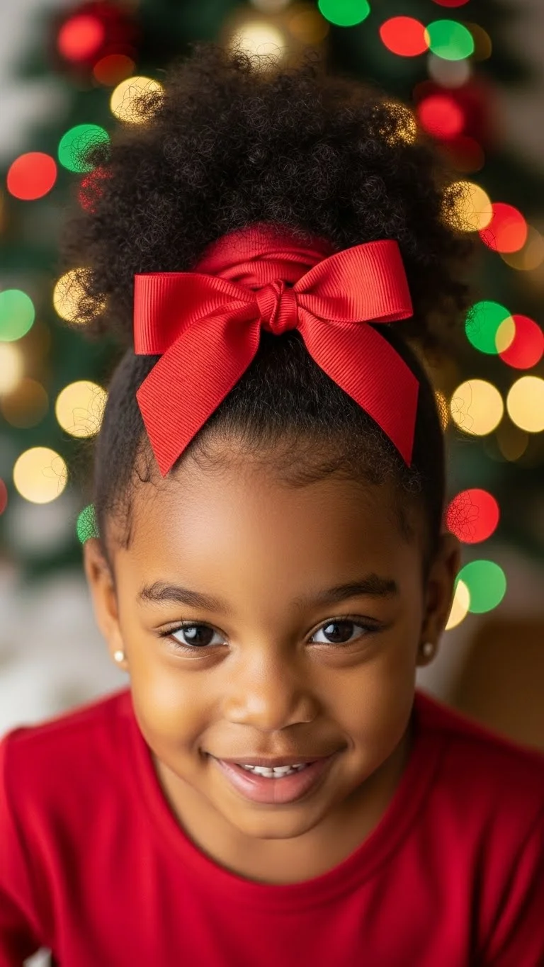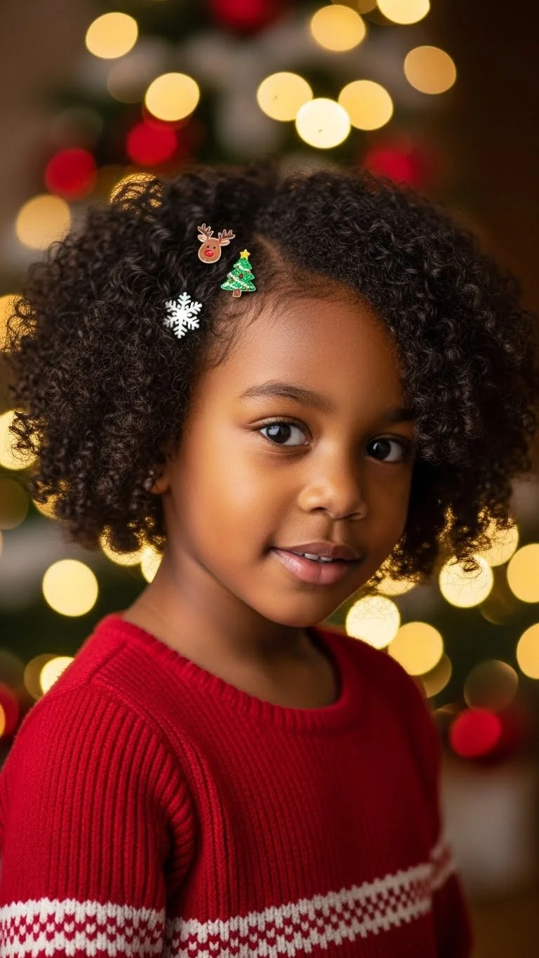 A high puff works well for all ages. It’s cute, quick, and doesn’t require long styling time. Start by moisturizing the hair lightly, then brush the sides upward. Use a soft-band hair tie to protect the edges. The puff sits at the top, showing off the child’s natural curls. Add a red or green bow clip for a festive touch. This style is gentle on the scalp and holds up through play. If you want it to look fuller, fluff the curls gently with your fingers. You can swap the bow for a glitter clip or a small pine-inspired accessory. Parents love this because it stays neat without constant fixing. It pairs easily with holiday sweaters and dresses. A little edge gel helps the front if you want a cleaner look, but it’s optional. This style is great for mornings when time is short.