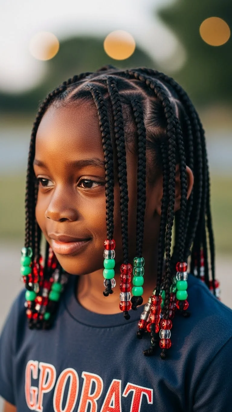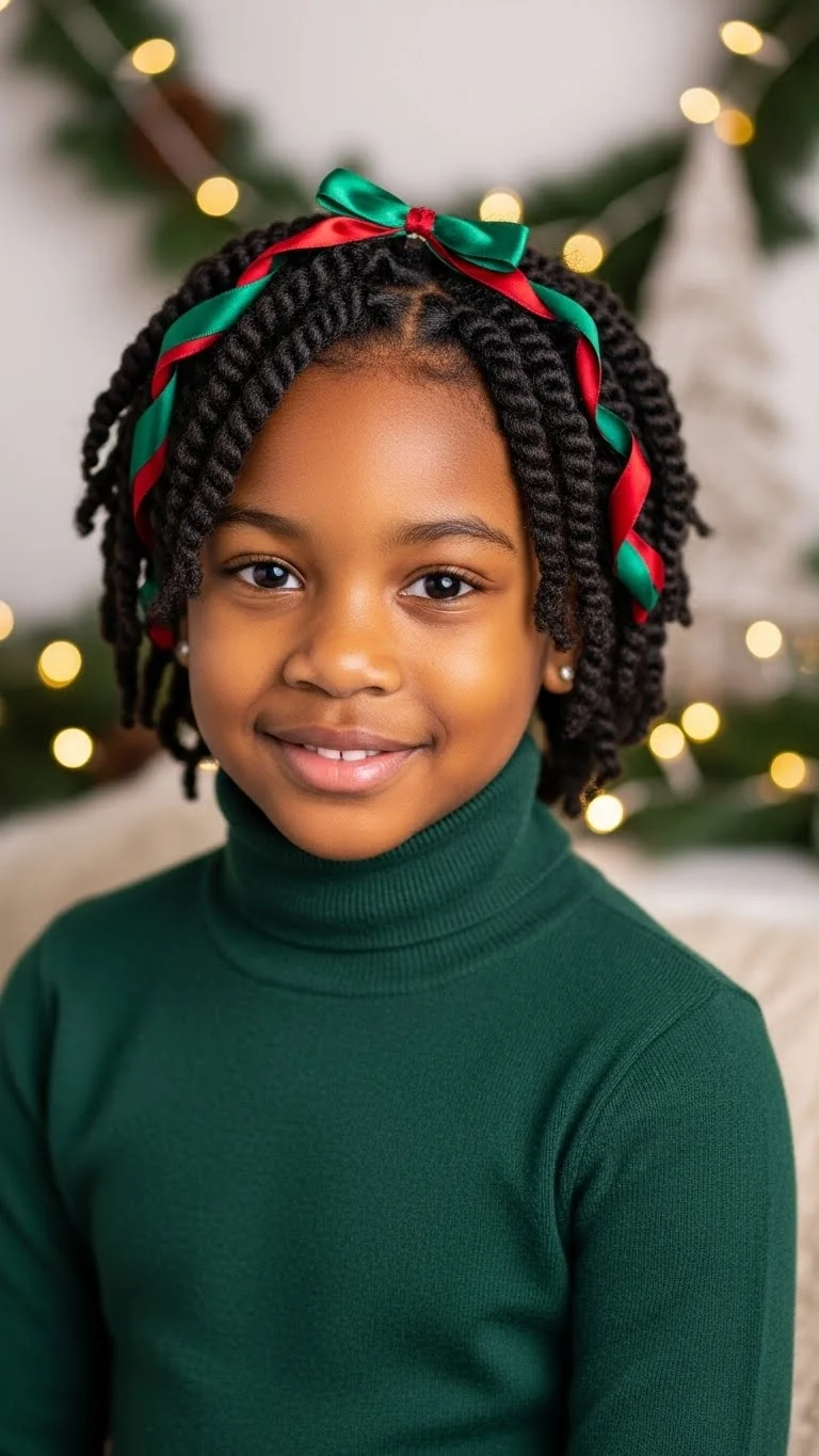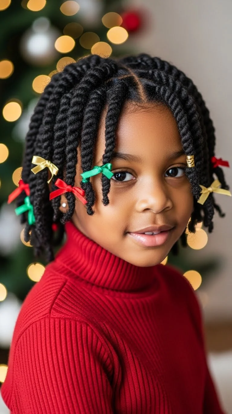 Box braids are classic and long-lasting. Keep them child-sized—small but not too tiny. Add beads in holiday colors at the ends. This style can last several weeks with gentle care. Parents who prefer easy mornings love this option. Use a satin bonnet at night to keep frizz low. The beads give a fun sound and movement that kids enjoy. A small ribbon tied at one side adds a cute Christmas touch. You can refresh the scalp with a little oil if needed. Perfect for travel or busy holiday schedules.
