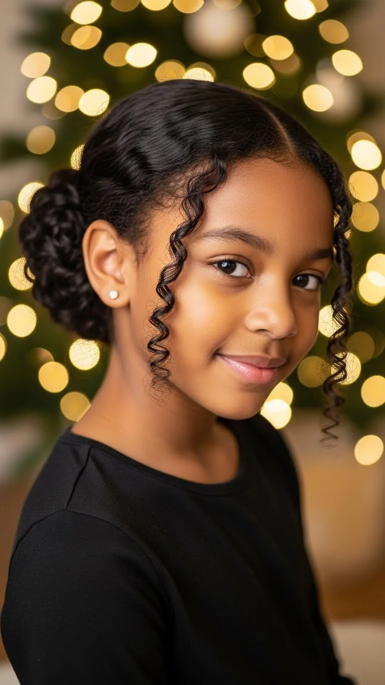 A low bun works well for kids who like their hair pulled back. Detangle the hair, brush it into a low ponytail, and twist it into a bun. Leave two small sections out near the ears to create soft tendrils. Curl them with water and a bit of styling cream. Use a holiday-themed scrunchie or ribbon for a seasonal touch. This style stays neat all day but still looks fun. It’s gentle and doesn’t pull too tightly. For younger kids, try a looser bun so it feels comfy. Keep a travel-sized spray bottle with water if the tendrils need refreshing throughout the day. You can decorate the bun with small clips for extra sparkle. Kids love this because the curls around their face look playful.
