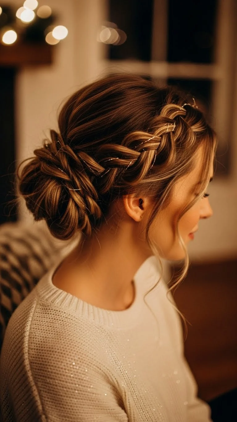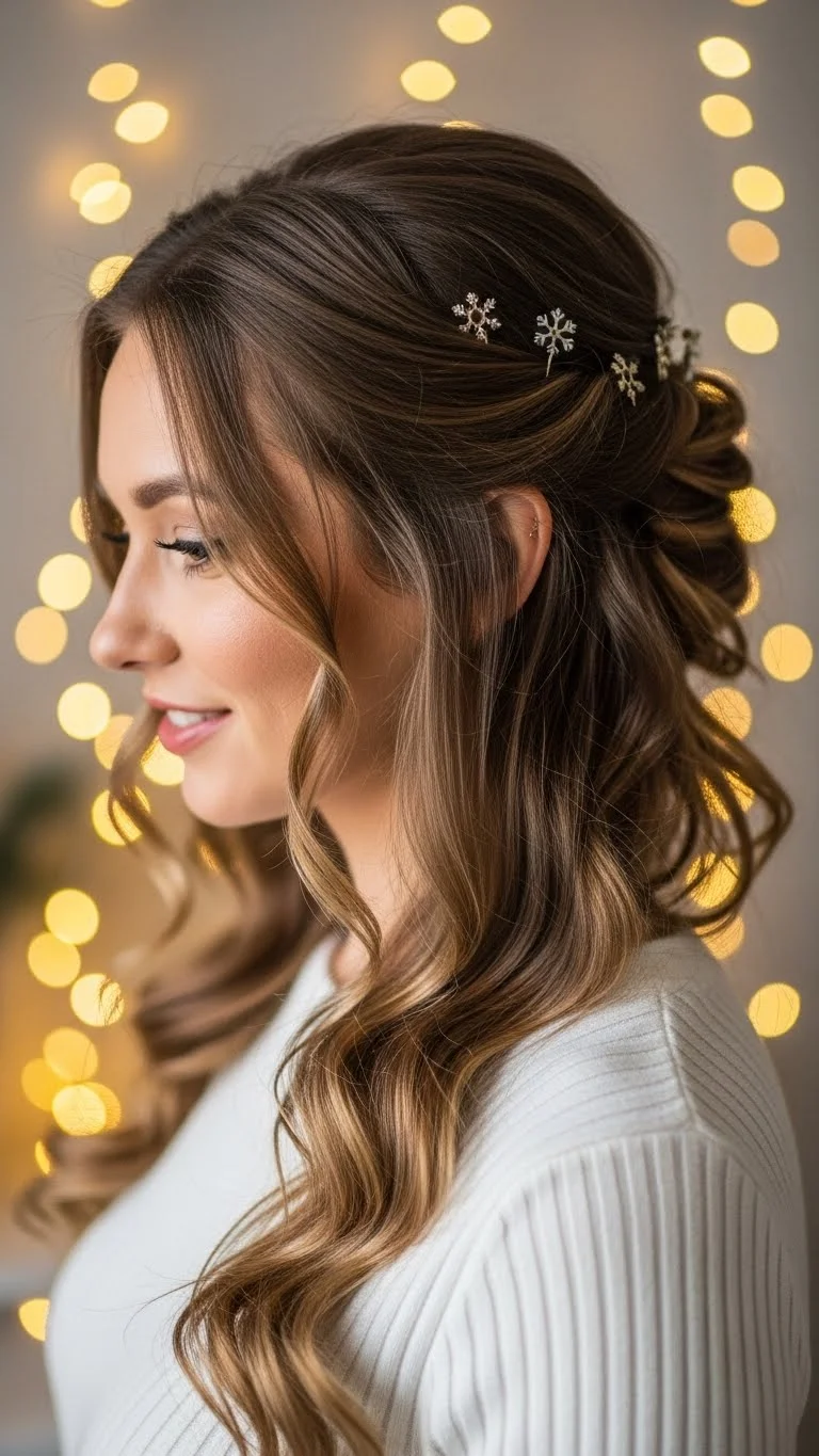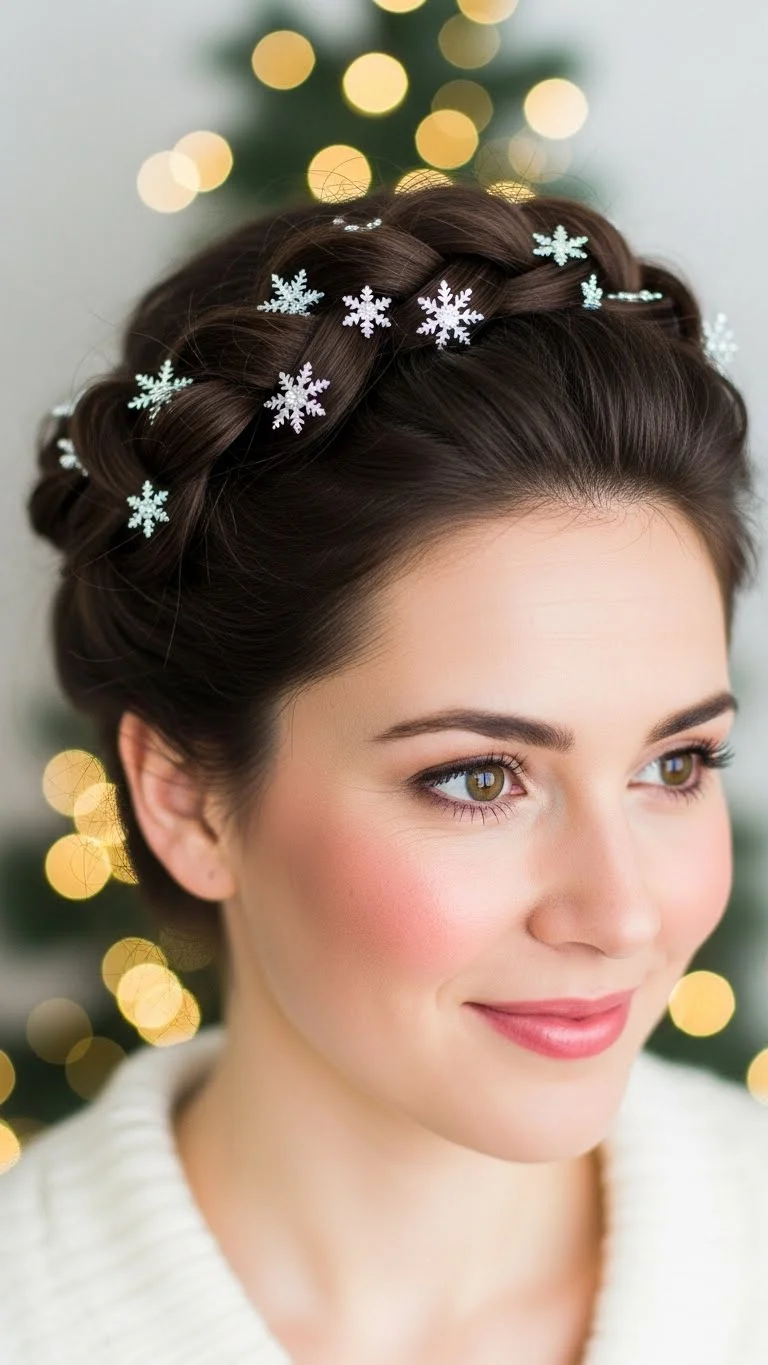 A crown twist is easy and gives a soft look around the head. Take two sections from the front and twist them back. Pin them together behind your head. Add mini snowflake pins for a delicate holiday touch. The style works for various hair textures. For curly hair, twist larger pieces. For straight hair, twist smaller ones. It stays comfortable all night and pairs nicely with warm outfits.