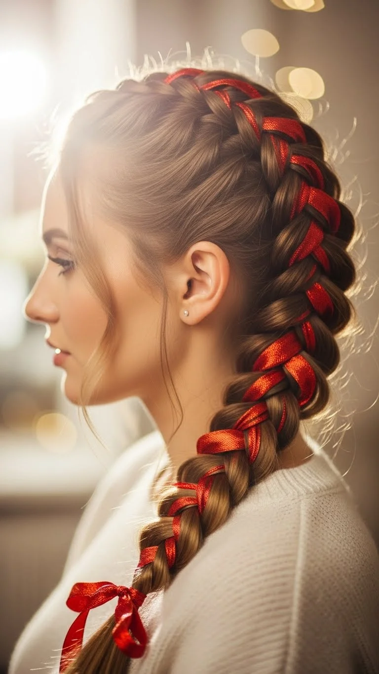 A French braid with a ribbon woven through feels playful and sweet. Start by tying the ribbon at the top section of your hair. Begin your French braid as usual, letting the ribbon weave in and out naturally. Keep the braid slightly loose so the ribbon shows. Use a soft, flexible ribbon to make the braid comfortable. This style works well on long or mid-length hair. If your hair is thick, use a wider ribbon. For thin hair, choose a narrow ribbon. You can match the ribbon with your outfit or pick a classic red for a holiday touch. This braid stays neat for hours and works for daytime gatherings. Add small pins near the end if you want extra detail. It’s an easy style to redo on the go.