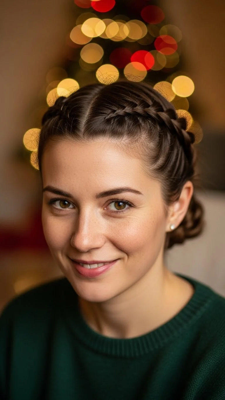 Two Dutch braids leading into a low bun offer a clean and festive look. Part your hair in the middle. Create a Dutch braid on each side, working down toward your neck. Once the braids meet, gather them into a small low bun. Add a simple pin or bead cluster. This look works great on active days because it stays steady. If your hair is thick, braid slightly tighter. For fine hair, add a bit of dry shampoo before braiding. You can match the bun size to your hair length—larger if you have long hair, smaller if you prefer a tiny shape. The braids add gentle detail without being too much for everyday holiday errands.