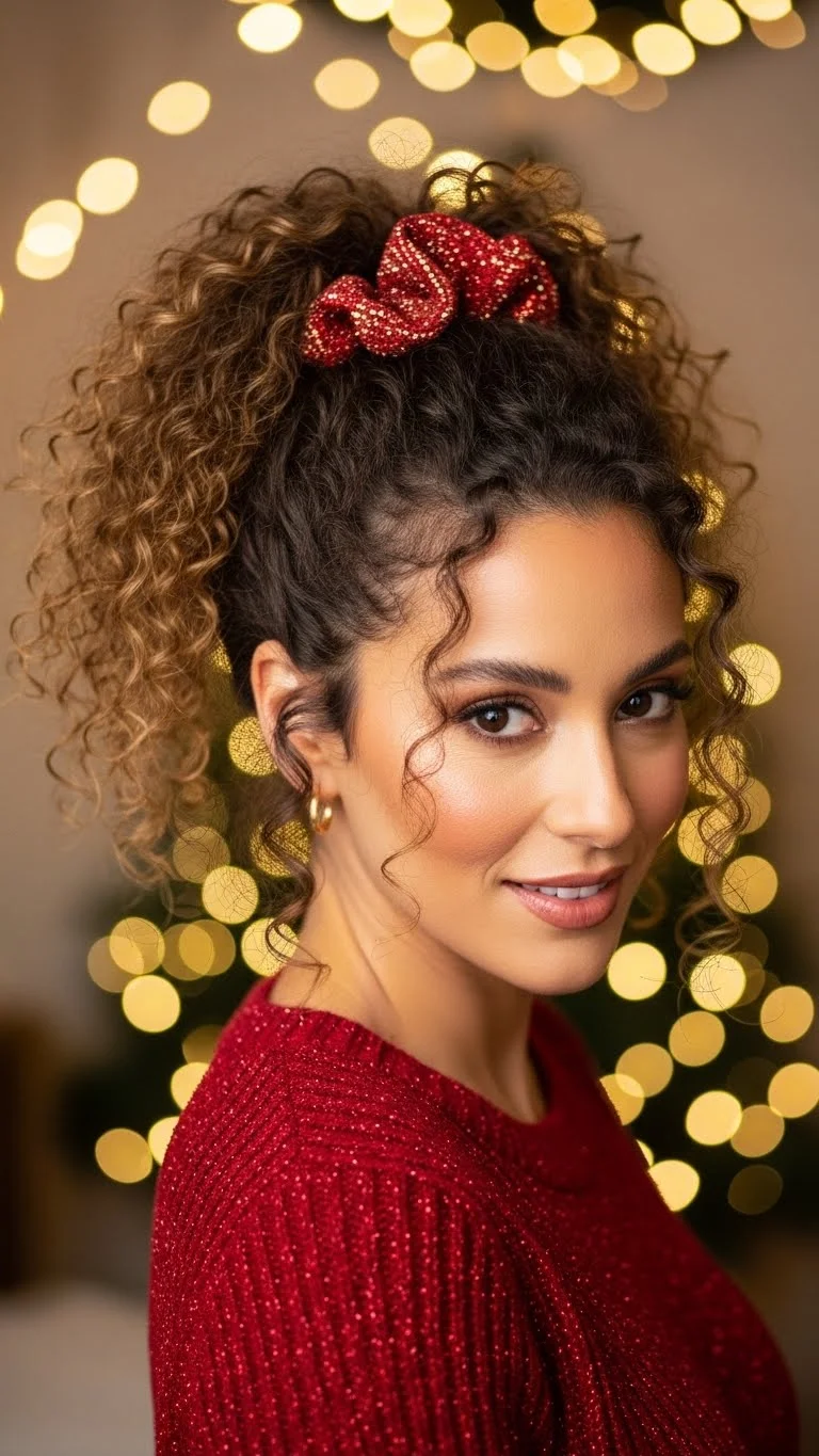 A curly ponytail with a decorative scrunchie feels playful and easy. Refresh curls with water or cream, then gather them into a mid or high ponytail. Slide on a holiday-themed scrunchie. Velvet or satin scrunchies work well. They’re cheap and come in pretty colors. The ponytail keeps hair off your shoulders while still showing your curls. For straight hair, curl the ponytail after tying it. You can pull small sections at the top to add light volume. This style stays comfortable and simple.