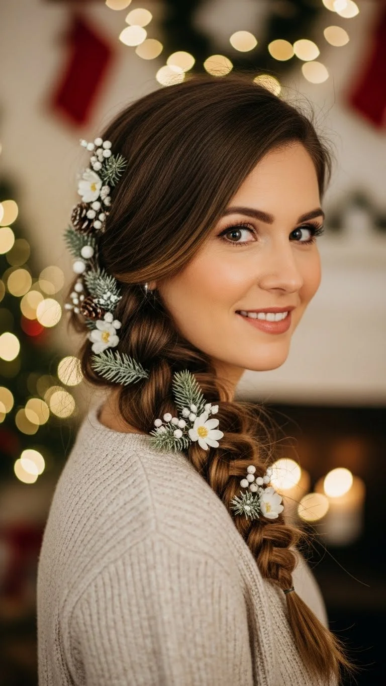 A side braid with winter florals gives a sweet seasonal touch. Start a low braid on one side and keep it loose. Add small floral clips shaped like winter blooms. These can be purchased affordably or made from craft supplies. The flowers give a gentle wintry feel without being too bright. If your hair is thick, pull the braid apart slightly for more volume. If it’s thin, keep the braid tighter. The style looks lovely with sweaters and scarves.