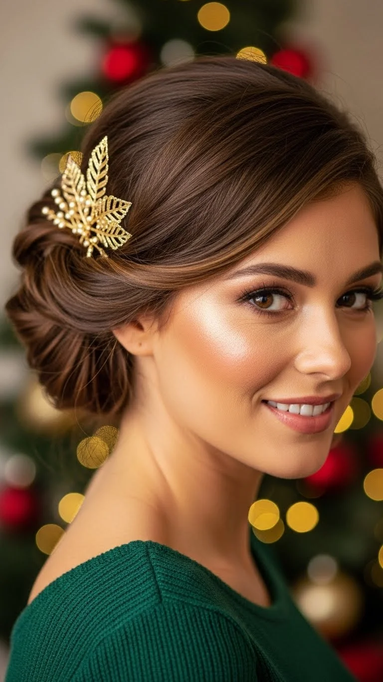 A loose low chignon feels warm and gentle, perfect for evening holiday gatherings. Start with dry, brushed hair. Pull it into a low ponytail and twist it lightly. Form a loose bun at the nape of your neck. Let a few strands fall naturally. Add small sparkle pins for a soft holiday glow. This style suits both thick and thin hair. If your hair is fine, tease the ponytail a little before twisting it. You can also pull some sections slightly to give a soft shape. For curly or wavy hair, let a few curls fall freely around the face. This gives an inviting frame. The chignon works with sweaters, dresses, or even casual outfits. It’s an easy way to look festive without spending a lot of time. If pieces fall out later, tuck them back in with a pin. It still looks pretty even when slightly messy.