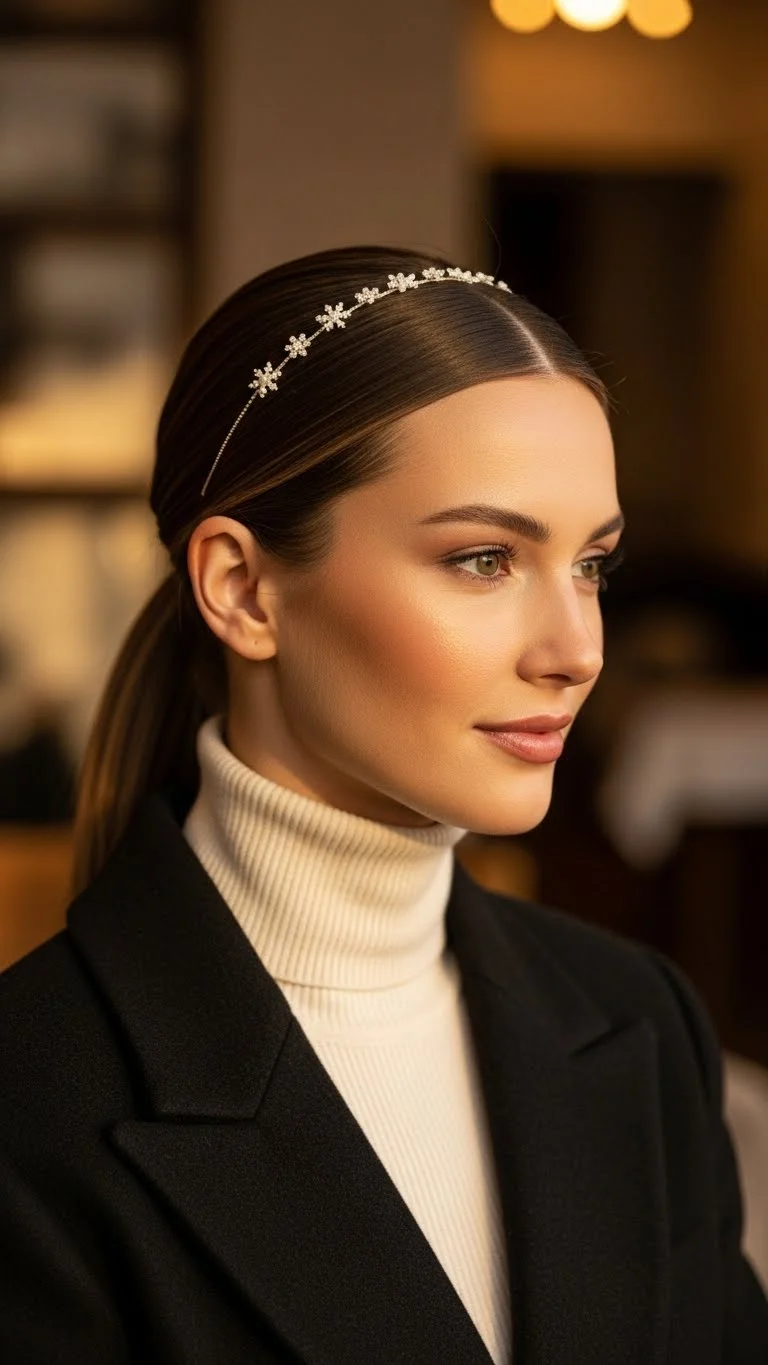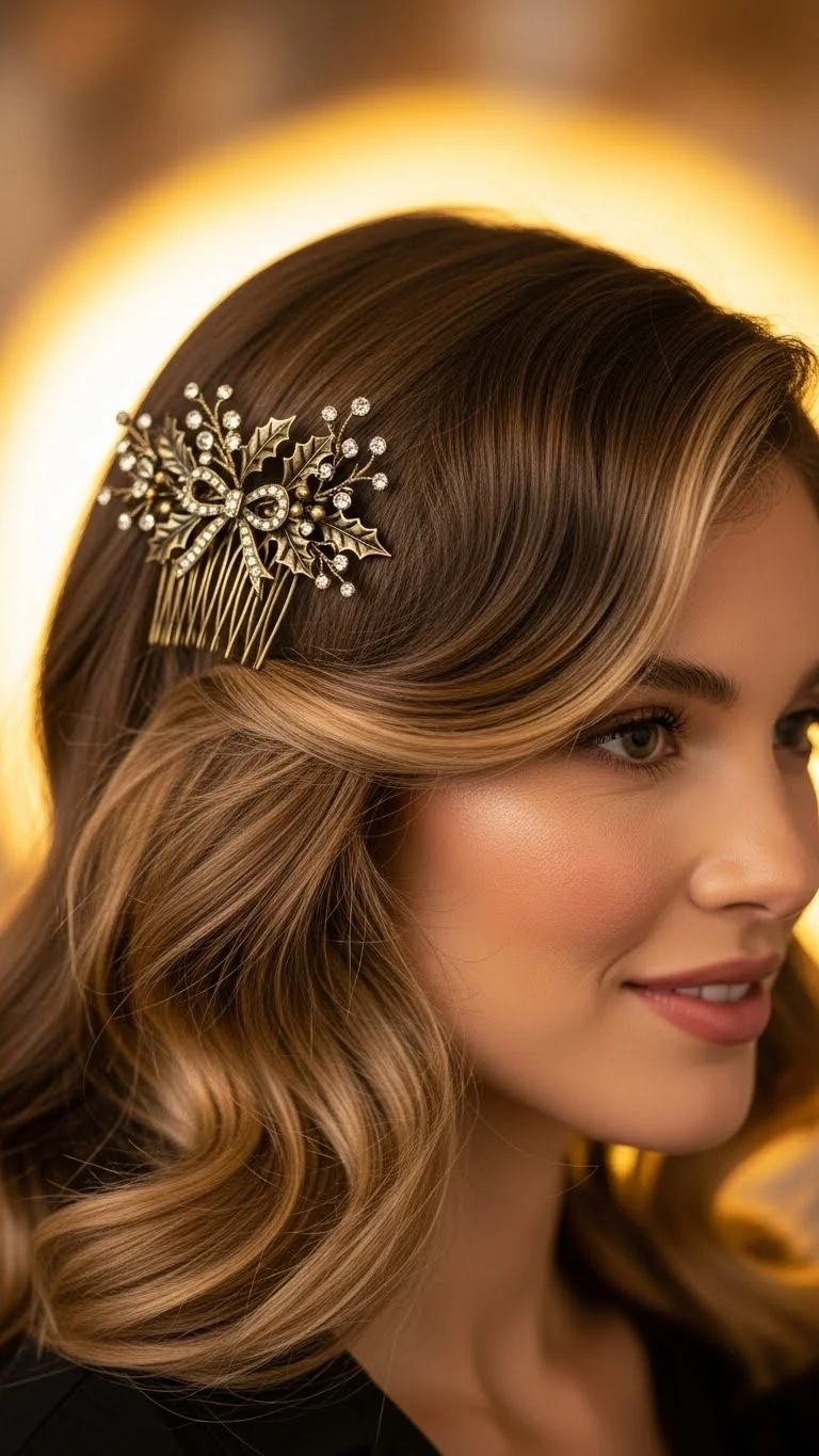 Straight hair looks polished with a crystal barrette on one side. Use a flat iron to smooth your hair. Add a tiny bit of serum to the ends. Part your hair slightly off-center and secure a long crystal barrette on the heavier side. Many affordable barrettes have crystals arranged in soft holiday shapes. This style takes only a few minutes to create. If your hair gets static, apply a small amount of hand cream to your palms and swipe lightly down the length. This calms the hair without adding weight. The barrette becomes the highlight, so keep the rest of your look simple. It’s great for dinner gatherings or casual events.