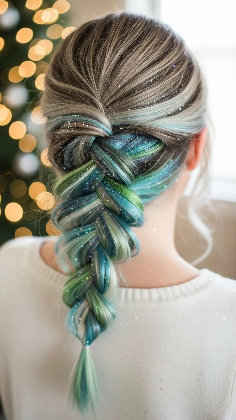 A waterfall braid looks detailed but is actually quite simple. Take a small section near your temple and begin the braid. Drop one section as you move around your head, letting it fall like a ribbon. Add tiny glitter accents by tapping a brush lightly. This style works on wavy or straight hair. For curly hair, define curls first, then braid. It looks soft and suits daytime holiday events.