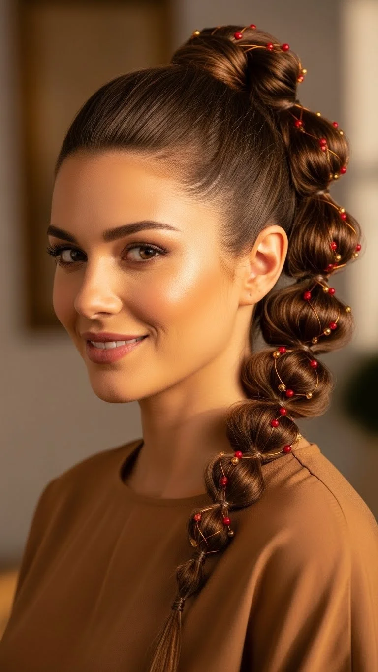 1. Bubble Ponytail with Holiday Beads