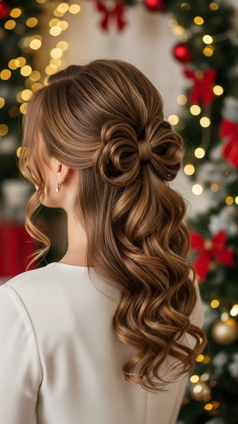 Create a soft twisted half-up when you want something simple and gentle. Start by curling your hair loosely or leaving it natural. Take two small sections from each side and twist them back. Bring them together with a small elastic. Add a cute clip or tiny pins for more charm. This look works on long, mid-length, or slightly shorter hair. If your hair is straight and fine, start with a light mist of texture spray. A budget-friendly option is to braid the twists a tiny bit before securing them. It helps them stay in place without buying extra products. For gatherings, choose soft waves to match the warm feel of the season. You can also wrap the elastic with a small piece of hair to hide it. Secure it with a hidden pin for a clean finish. This style stays comfortable for hours, and you can redo the twists quickly if they loosen. It fits casual or dressy outfits. Add a touch of shimmer by sliding in small metallic stars. It stays gentle on the hair, making it an easy pick for any holiday plan.