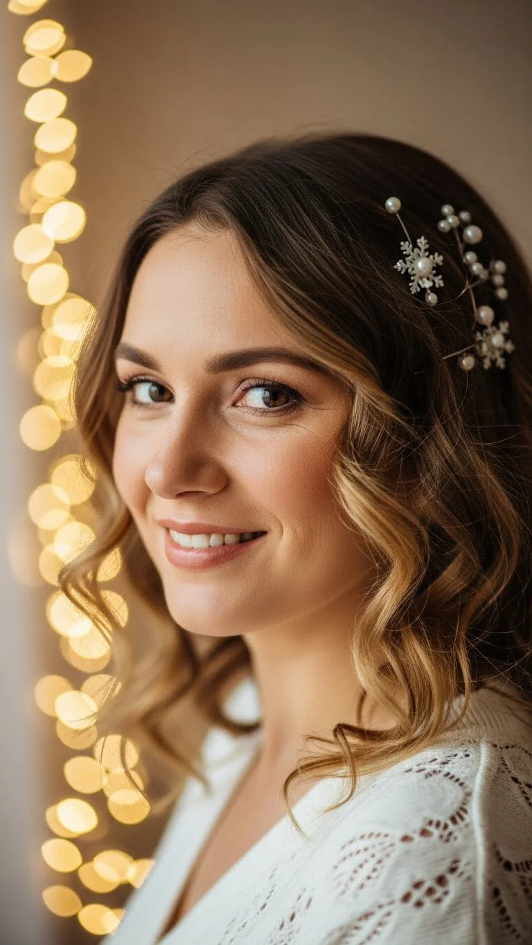 Romantic loose curls feel warm and graceful for holiday photos. Use a curling wand or flexible rollers. Keep the curls soft, not tight. Once they cool, gently shake them out with your fingers. Add small pearl pins or snowflake clips near one side. This gives the hair a gentle festive sparkle. You don’t need pricey accessories—many discount stores carry sets for very little. A small side part brings more softness to the style. If your hair doesn’t hold curl easily, spray each section lightly before curling. For curly or wavy hair, refresh the natural pattern with water and leave-in conditioner. Then add the pins once the hair dries. Keep the accessories near the front for the prettiest effect. You can blend gold and silver pieces for a holiday feel without looking too bright. The style looks lovely in both indoor and outdoor lighting. Loose curls frame the face well, so it’s a nice choice if you want gentle definition without much effort. The pins help keep one side neat, making the overall style look intentional without taking extra time.