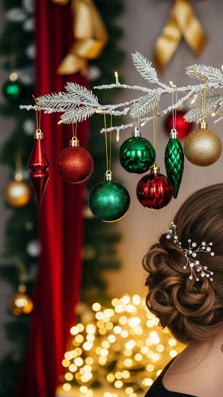 A braided crown always feels special, and adding small ornament-like beads gives it holiday charm. Start by parting your hair down the middle. Braid each side into a three-strand braid. Pull each braid upward over your head and pin them to form a crown. Slide in tiny beads or small metallic accents to mimic mini ornaments. These can come from simple craft kits that cost very little. Make sure the braid isn’t too tight so it looks soft. If your hair is short, braid only the top half and pin it across the head. For curly hair, let a few curls fall around the face for a gentle frame. The style sits comfortably and stays steady all evening. If you want more shine, spray a light mist of shimmer spray at the very end. Keep the beads spaced evenly, so the crown looks balanced from every angle. This hairstyle pairs well with dresses featuring soft fabrics. It stays pretty in photos and works great for family gatherings or holiday dinners.