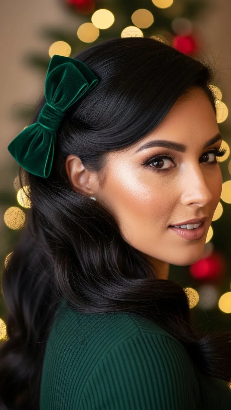 Side-swept waves always feel warm and elegant during winter months. Start by curling your hair loosely with a flat iron or wand. Bring all the curls to one side and secure them with hidden pins behind your ear. Add a velvet bow toward the back for a soft touch. Velvet bows are inexpensive and available in many rich holiday shades. If your hair is naturally wavy, refresh the texture with a little water and cream. This style works for medium or long hair and blends well with festive clothing. To keep the waves smooth, brush them lightly with a wide-tooth comb. Avoid over-brushing so you don’t flatten the wave pattern. If you want extra shine, use a bit of serum on your ends. The bow brings a gentle holiday charm without overpowering the look. The style stays comfortable for hours and sits well under scarves or coats. You can adjust the pins throughout the night without changing the shape.