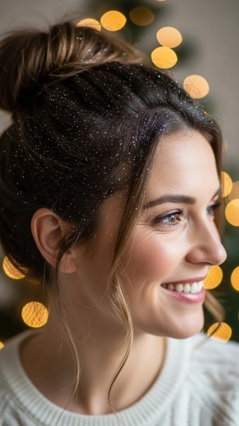 A messy bun with a hint of glitter feels carefree and fun for holiday gatherings. Pull your hair into a high or mid-level ponytail. Twist it loosely and wrap it into a messy bun. Pin it in place without trying to make it perfect. Lightly tap glitter dust near the bun using a soft brush. You can find cosmetic-safe glitter at low prices. Keep it subtle so it catches the light without looking too bright. Leave a few pieces of hair around your face for softness. This style works with thick or thin hair because the messy shape hides small flaws. If your hair is straight, add a bit of texture spray first. For curly hair, let the curls stay natural and tuck only the top section into the bun. The glitter adds a gentle holiday sparkle. Try gold for warm outfits or silver for cooler tones. Carry a small brush with you if you want to remove excess glitter later. This style feels relaxed and fits both casual and semi-formal plans.