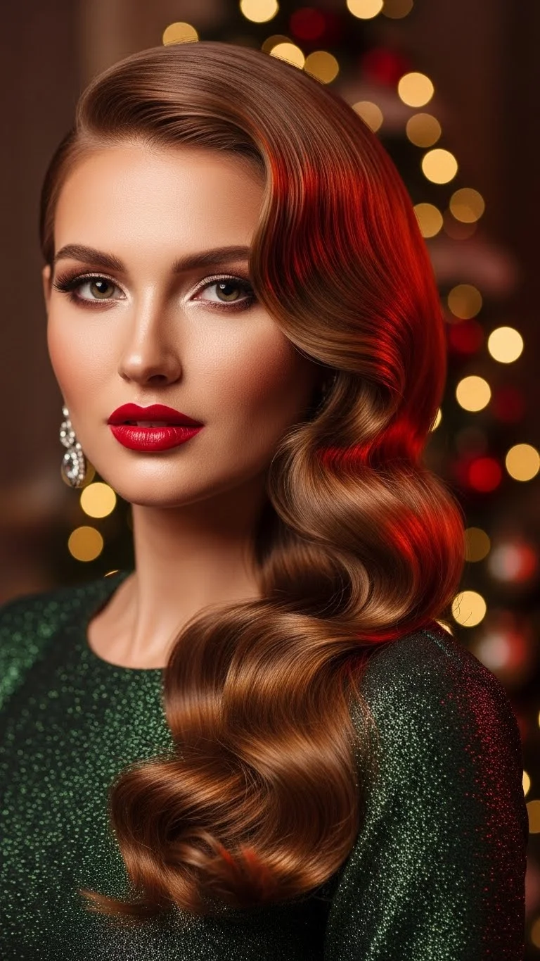 Hollywood waves bring soft movement and an old-holiday-movie vibe. Use a large-barrel iron to curl each section in the same direction. Let the curls cool before brushing them into a single flowing pattern. Add a light spray to keep the shape but avoid stiffness. This look works best on mid-length to long hair. If your hair resists holding curls, curl smaller sections. For budget ideas, use foam rollers and let them set while you get ready. Smooth the top with a gentle comb so the waves look connected. You can tuck one side behind your ear and add a simple clip. This gives you a graceful, polished look perfect for photos. Hollywood waves match well with sparkly dresses or simple black outfits. They hold up through indoor events and holiday dinners. Carry a small comb for quick touch-ups. The style feels soft and comfortable all night.