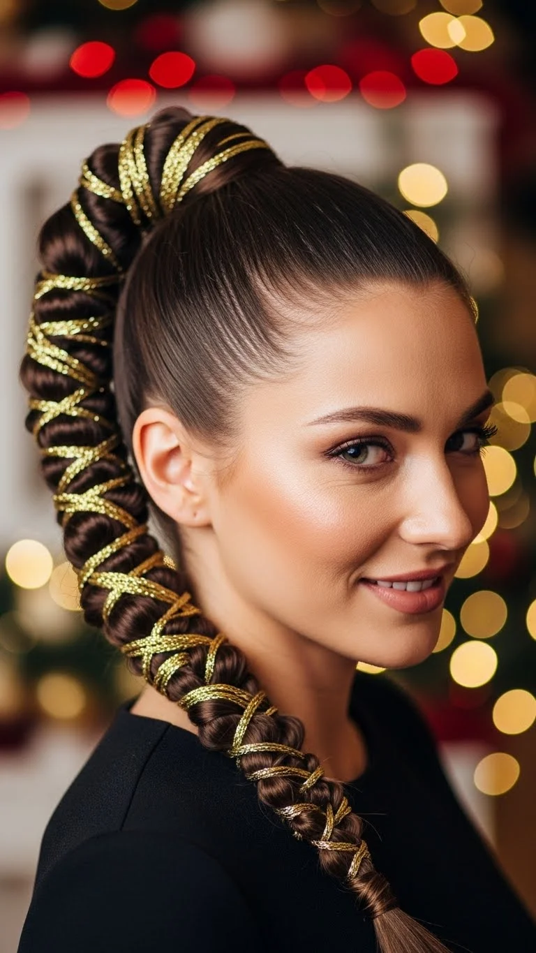 A braided ponytail with metallic threads gives a fun holiday twist to a classic style. Start by pulling your hair into a secure ponytail. Add a little bit of cream to smooth the top. Divide the ponytail into three sections and braid it. As you braid, weave in thin metallic threads. These threads are sold in craft aisles and cost very little. Tie the braid at the bottom and trim the thread ends. If you want a cleaner look, wrap a small piece of hair around the base of the pony. This style works for straight or wavy hair. For curly hair, stretch the curls slightly before braiding to help the thread show better. Choose gold, silver, green, or red depending on your outfit. The metallic lines catch the light gently and feel festive without being too bright. You can redo the braid whenever you want because it’s simple and quick. It stays neat throughout the night and feels light on the head.