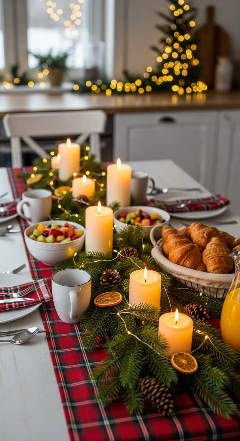Add a runner down your table or island to set a festive base. Choose fabric that matches your theme — plaid for rustic charm or metallic for a glam look. You can DIY one with leftover fabric or even wrapping paper for a short-term setup.