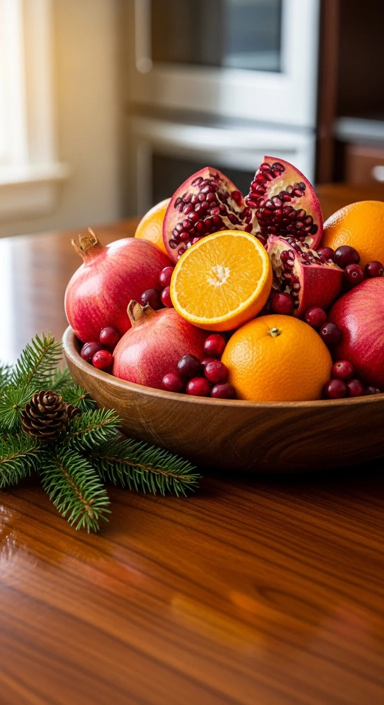 Swap everyday fruit for holiday colors. Fill bowls with oranges, pomegranates, and cranberries. Add some pine branches for texture. It’s natural, inexpensive, and adds a cozy farmhouse look without much effort.