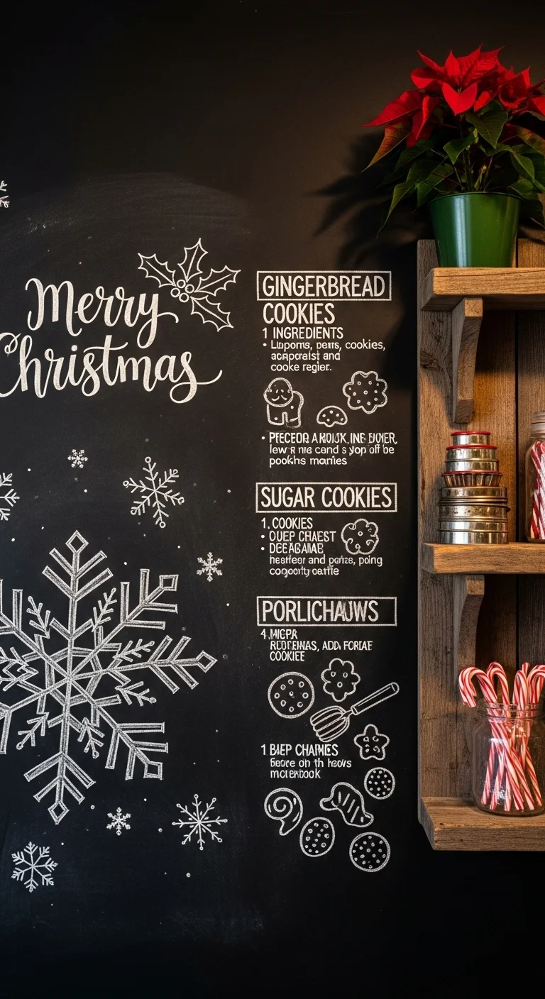 If you have a chalkboard wall or menu board, draw snowflakes or write a fun Christmas quote. Let kids add doodles too. Chalk art gives your kitchen a personalized and playful feel — and you can erase it after the season.