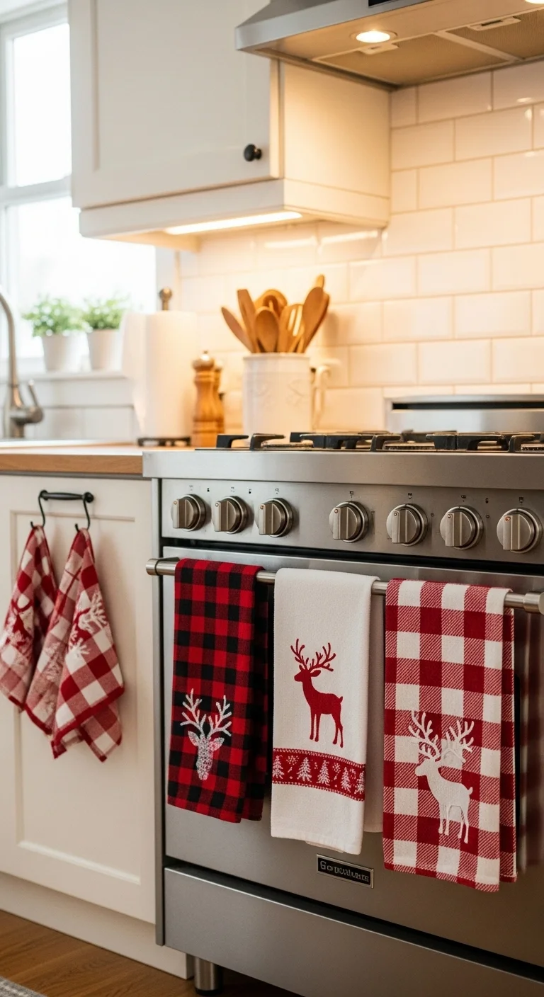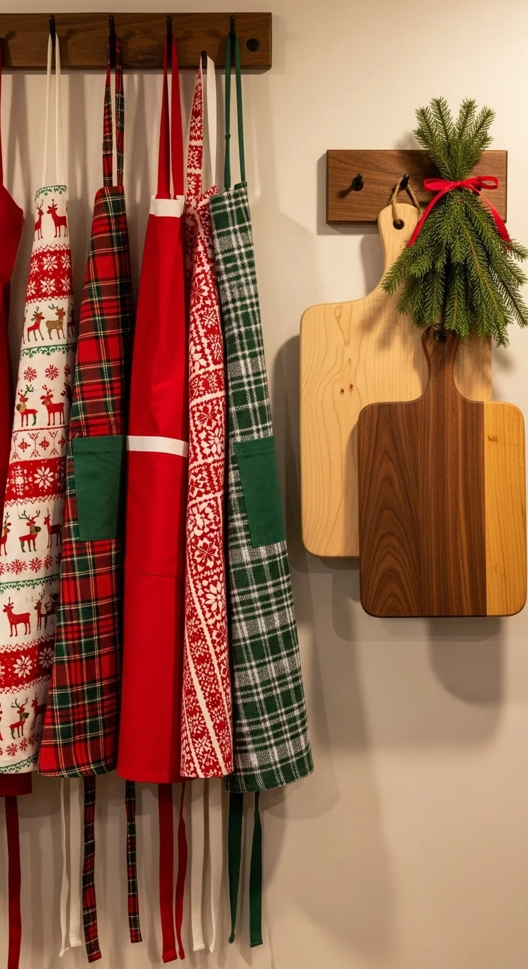 Swap your regular aprons for Christmas-themed ones. Hang them visibly on hooks to double as decor. You can even sew your own from leftover fabric. They make everyday cooking feel festive while adding personality to plain walls.