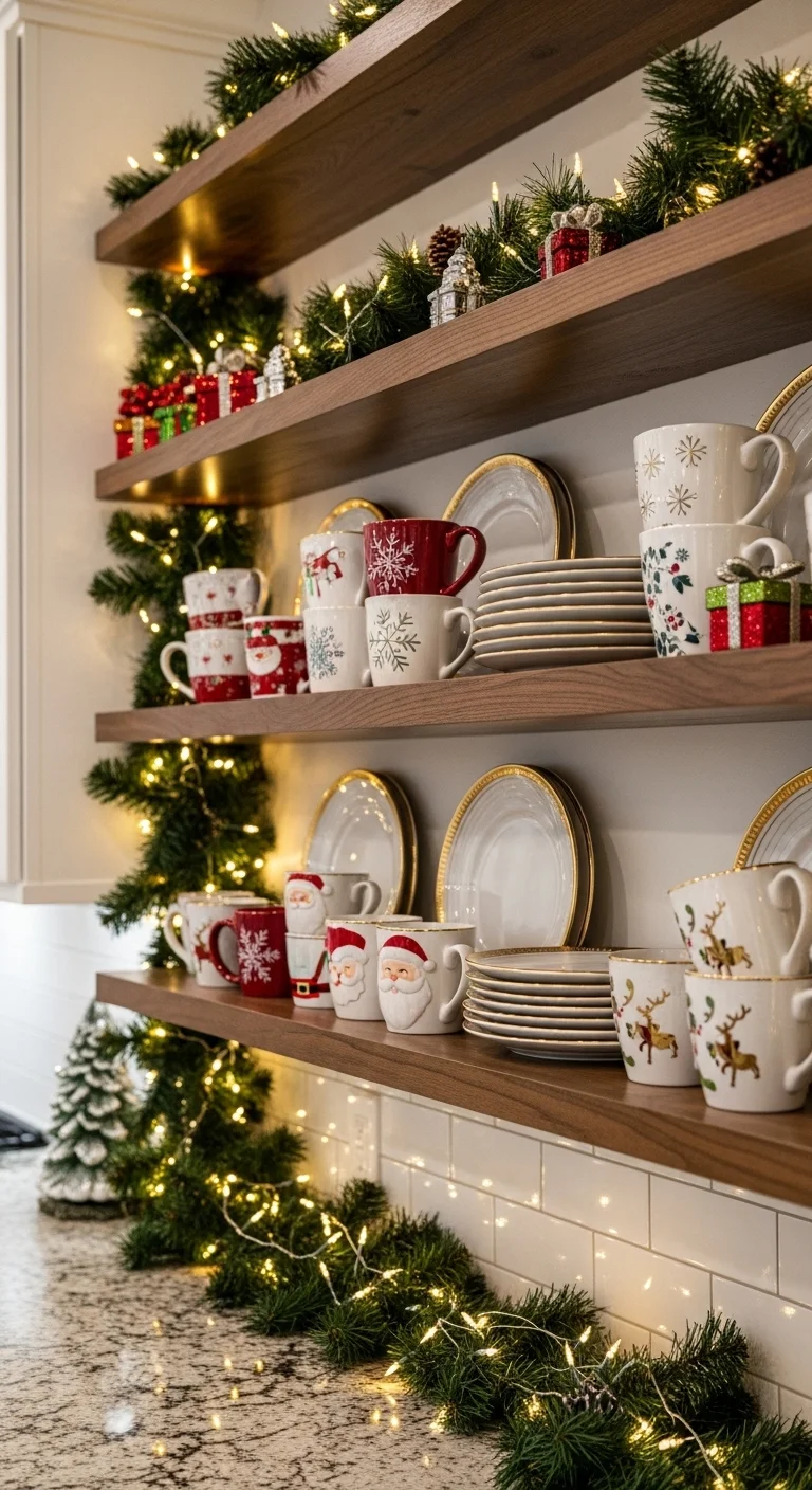 Style open shelves with touches of Christmas — a few holiday mugs, a mini wreath, and some greenery. Keep it light so it doesn’t feel cluttered. Mixing textures like wood, ceramic, and glass makes it visually warm and cozy.