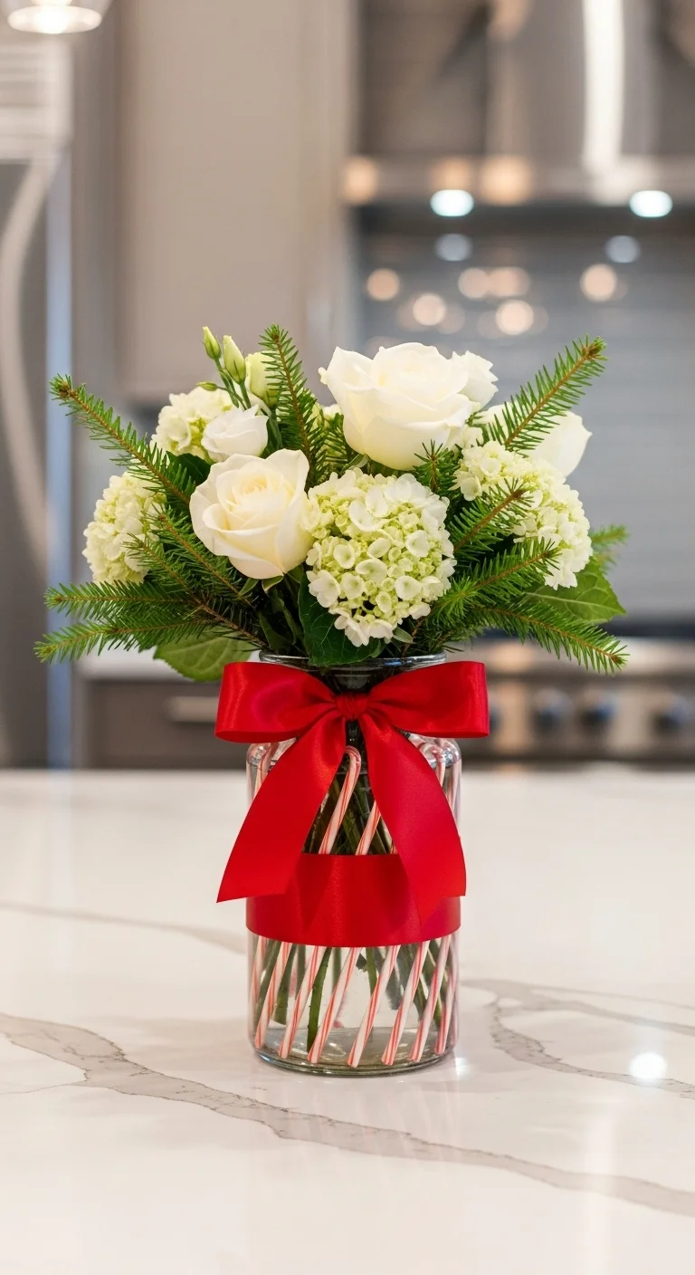 Turn candy canes into decor by gluing them around a vase. Fill it with white flowers or greenery. It’s inexpensive and adorable — a perfect centerpiece or counter accent that kids love helping with.