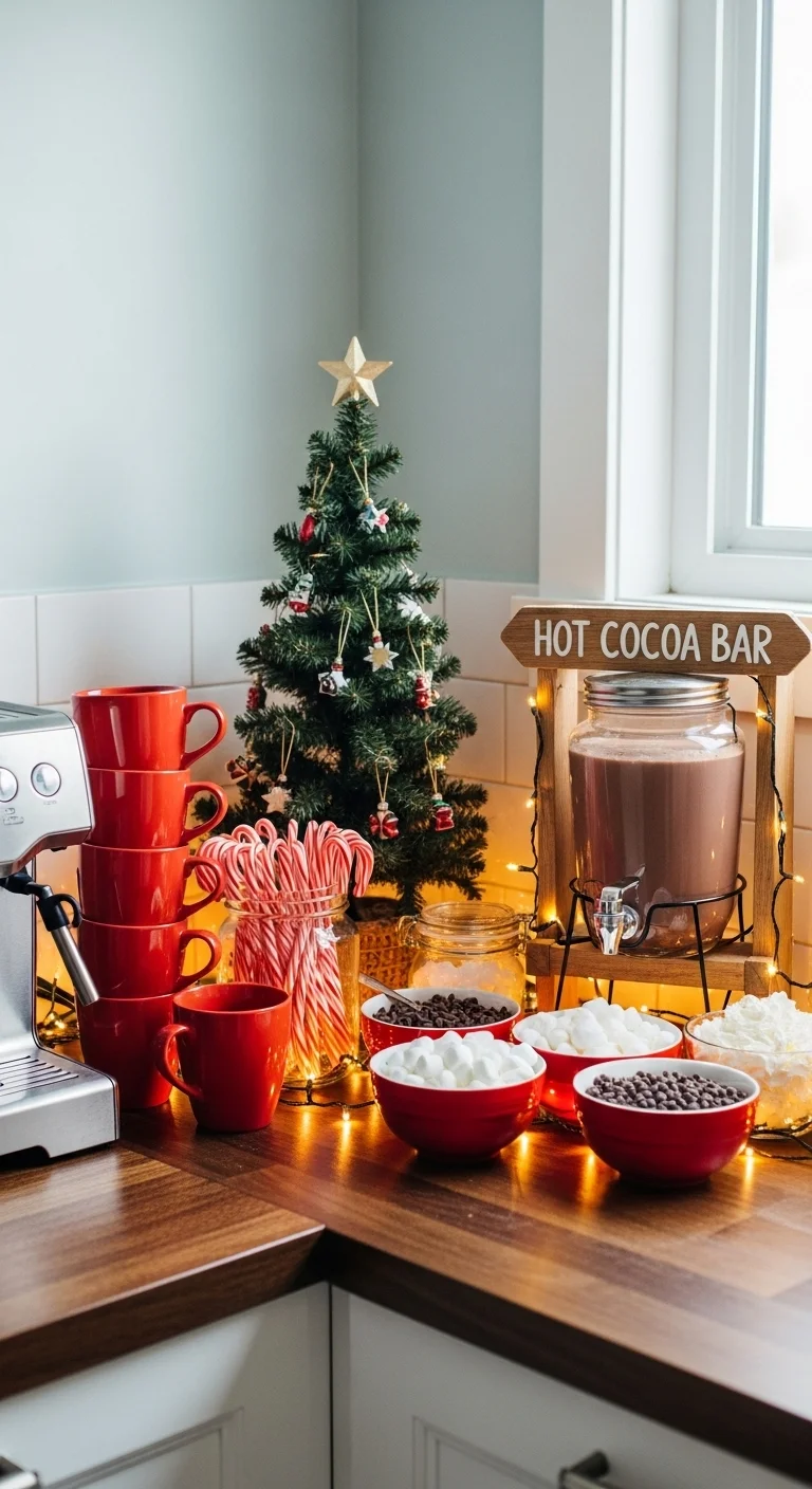 Turn your coffee corner into a mini winter café. Display holiday mugs, a jar of marshmallows, and candy canes for stirrers. Add a festive tray and a small sign for personality. A mini wreath or garland around the shelf pulls the look together. Keep it cozy yet functional so you can actually use it daily.