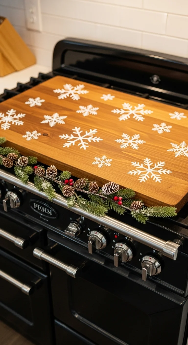 Create extra counter space with a decorated stove cover. Paint it white or red and add stenciled Christmas patterns. It’s both functional and decorative — perfect for smaller kitchens needing extra prep space.