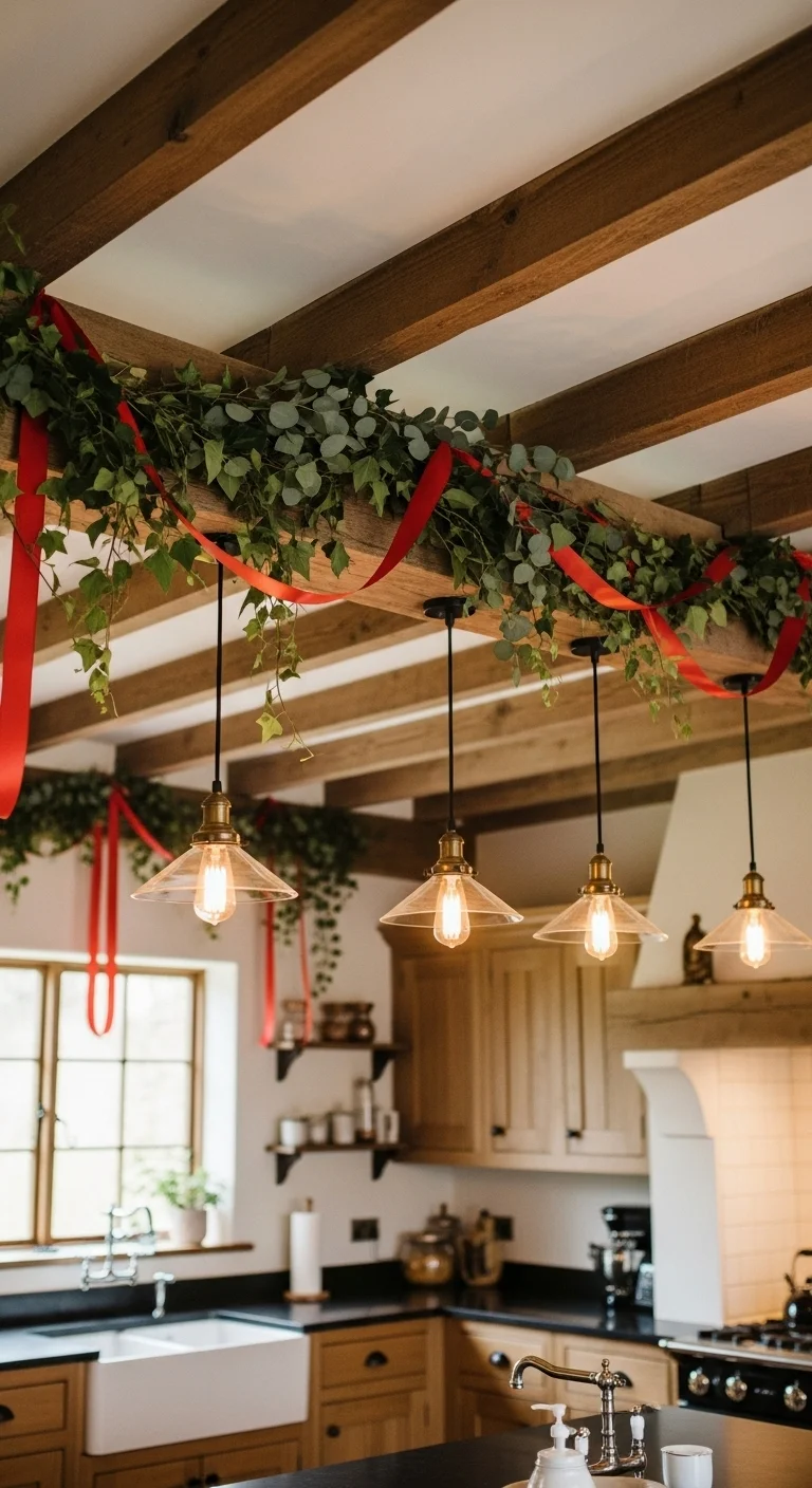 If your kitchen has exposed beams, hang garland from them. Add ribbon tails or ornaments for a dramatic look. It draws the eye upward and fills the room with texture.