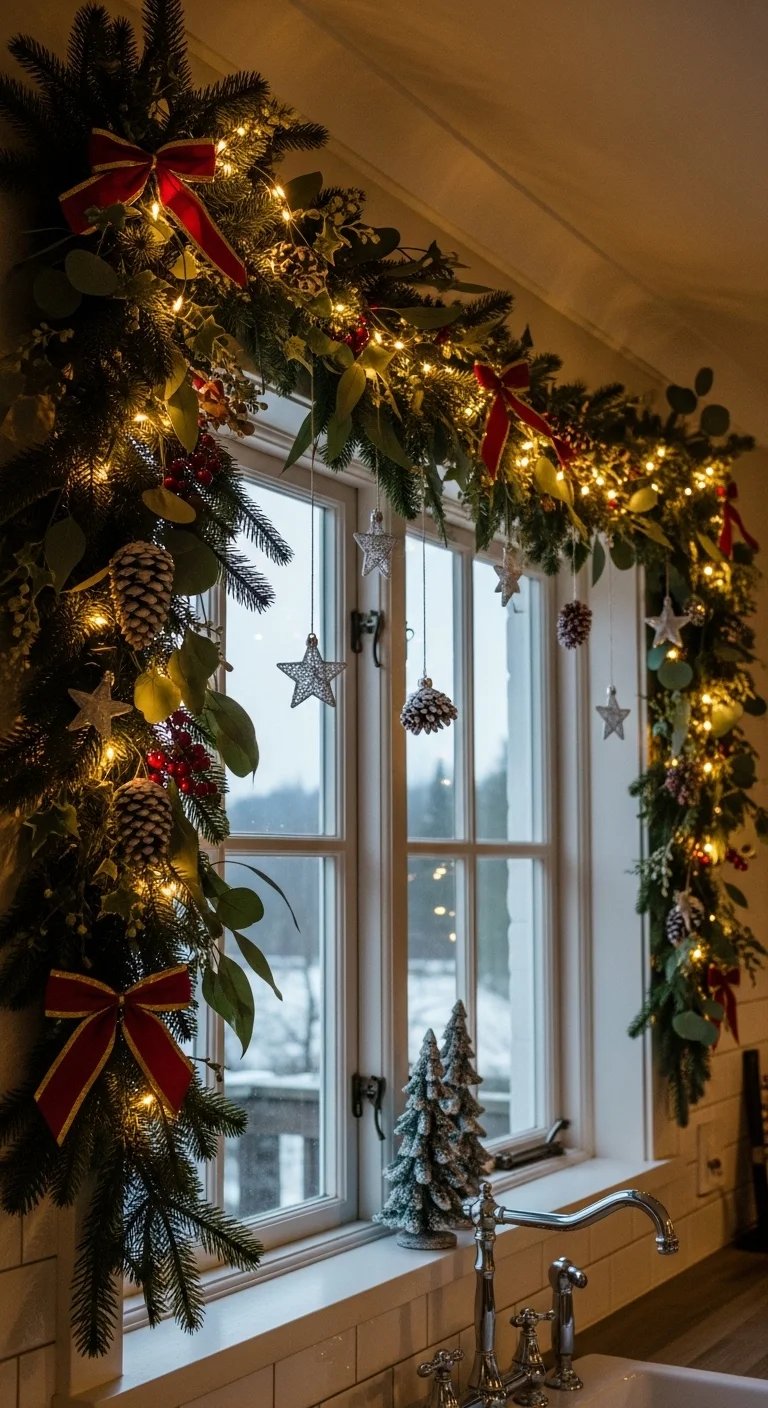 Dress your kitchen window with a lighted garland. Use suction hooks for easy hanging. Add small bows or snowflake ornaments for sparkle. When sunlight hits during the day, it gives a magical shimmer that brightens the whole room.