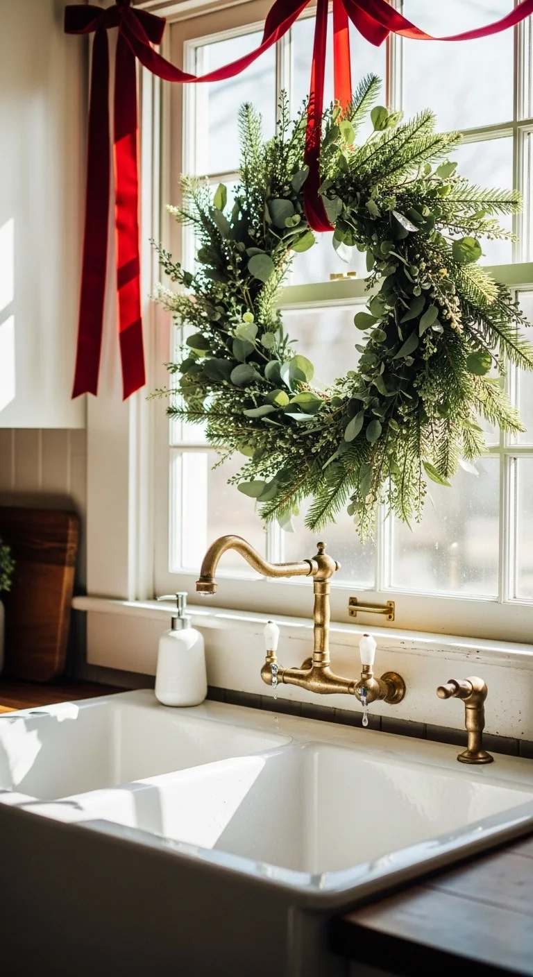 Hang a small wreath above your kitchen sink to bring the outdoors in. Choose one made with faux pine or dried orange slices for a classic touch. Add a ribbon that matches your kitchen’s color palette. It’s a simple decor move that instantly catches the eye while you wash dishes.