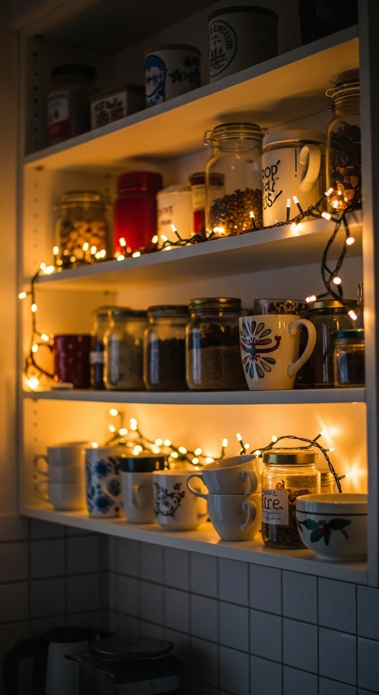 Fairy lights make any kitchen magical. Wrap them around shelves, along window frames, or across countertops. Choose battery-operated ones to avoid cords. For an eco-friendly tip, use rechargeable batteries. Soft white or golden tones keep the lighting warm and inviting instead of harsh.