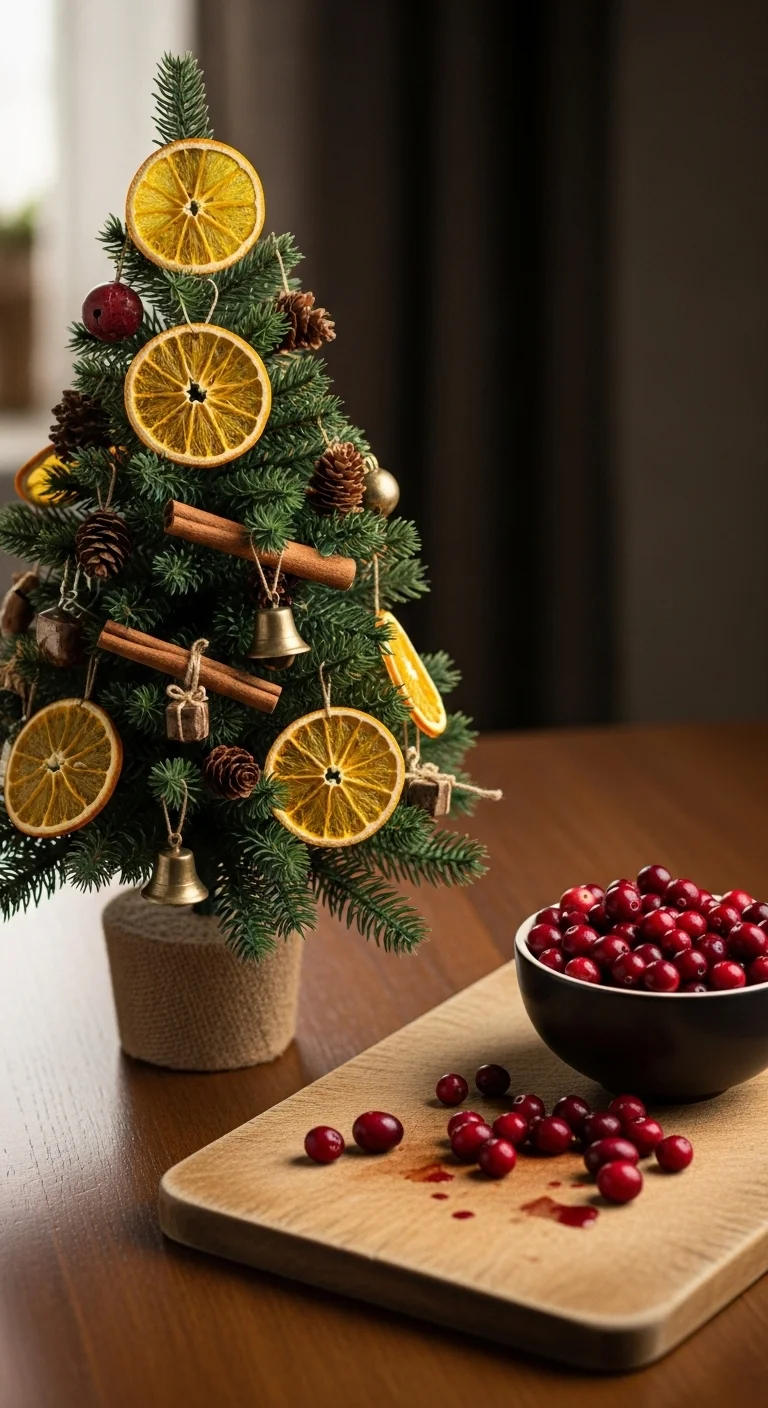 A little tree brings big charm. Place a mini pine on your island or counter and decorate it with ribbon scraps, cookie cutters, or cinnamon sticks. Use a mason jar or ceramic pot as a base. It’s an easy DIY touch that doesn’t take up much space but adds holiday spirit instantly.