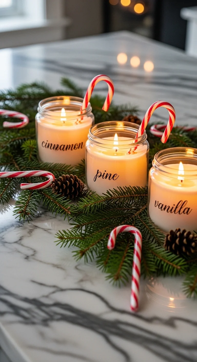 Scent sets the holiday mood. Choose candles that smell like cinnamon, pine, or baked cookies. Group them on a tray with pinecones or ornaments. If open flames aren’t ideal, try battery-powered candles for safety. A warm fragrance makes the kitchen feel cozy even when you’re not baking.