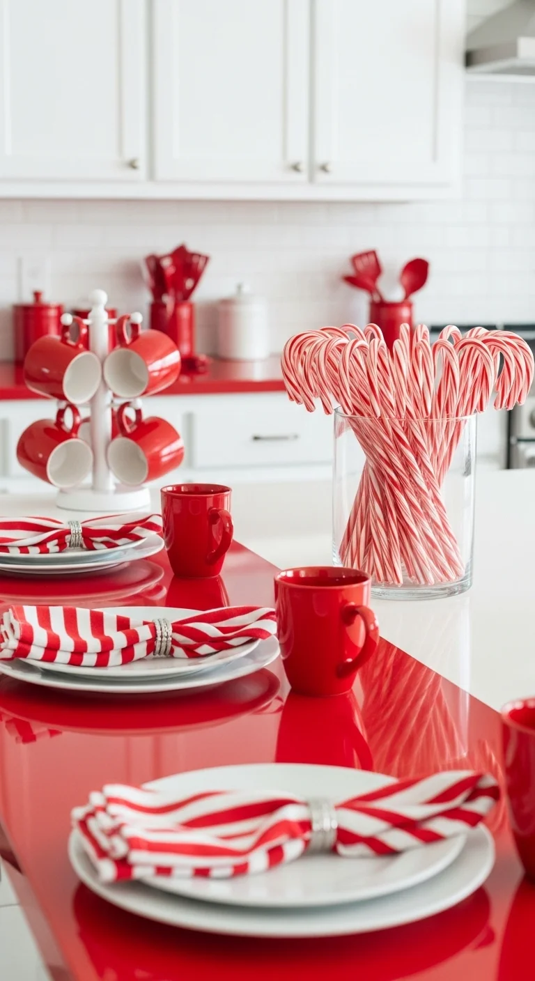 Stick to a red-and-white palette for a clean, classic Christmas vibe. Use candy canes, striped linens, and red bowls for pops of color. This theme pairs beautifully with neutral kitchens. You can mix in a few green accents for contrast, but simplicity keeps it chic.