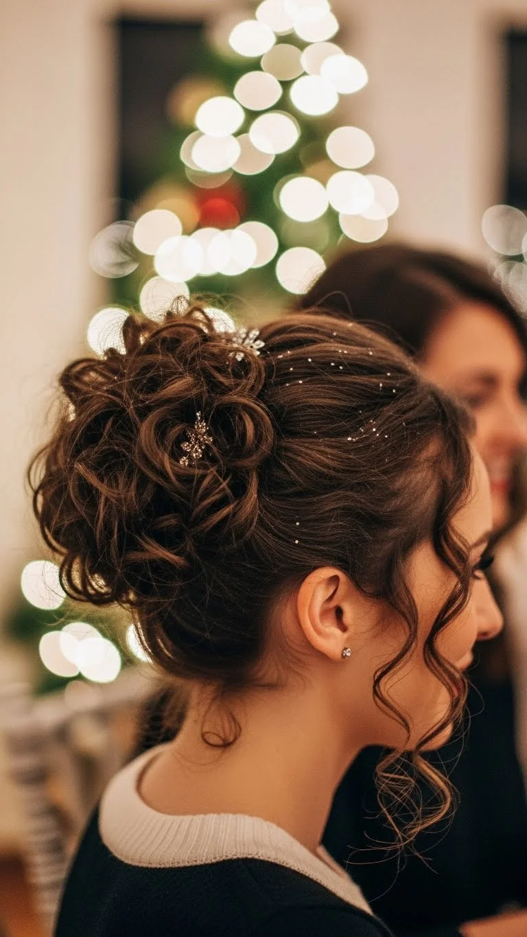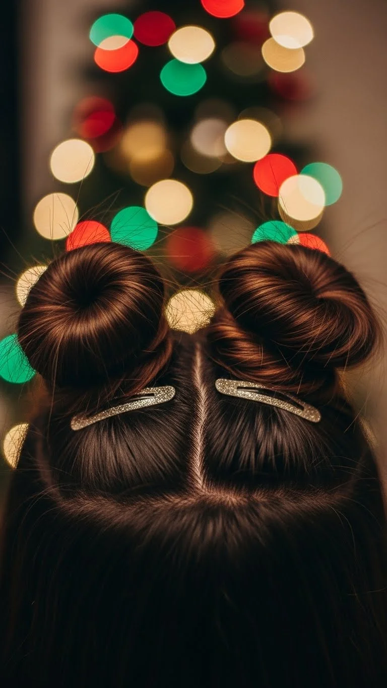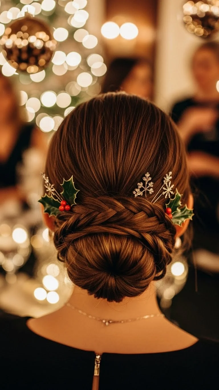 A messy bun works well when you’re short on time. Pull hair into a loose bun and pin randomly. Let some strands fall. Add sparkle pins for a holiday touch. You can find packs of pins for low cost. Curl a few face pieces for softness. This look suits both casual sweaters and dressy outfits. It feels relaxed but festive.