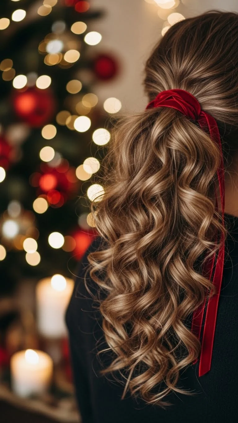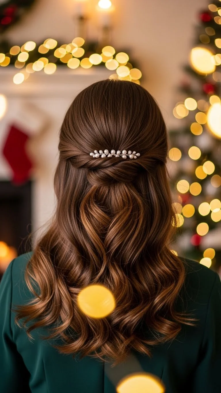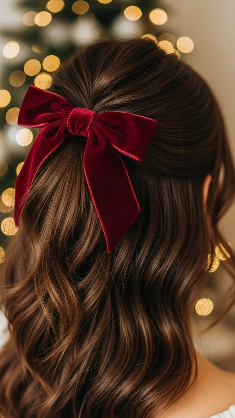 A velvet bow brings instant charm. Pull the top half of your hair back. Tie it with a small elastic. Clip the bow right above it. Curl the ends for movement. Velvet bows are affordable and come in holiday colors. If you want more hold, tease the crown lightly before securing. This keeps the shape lifted. This style suits both casual and formal outfits.
