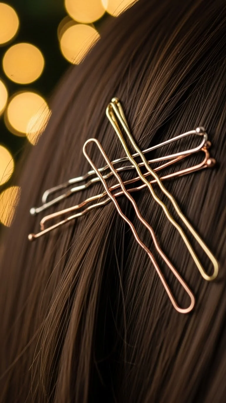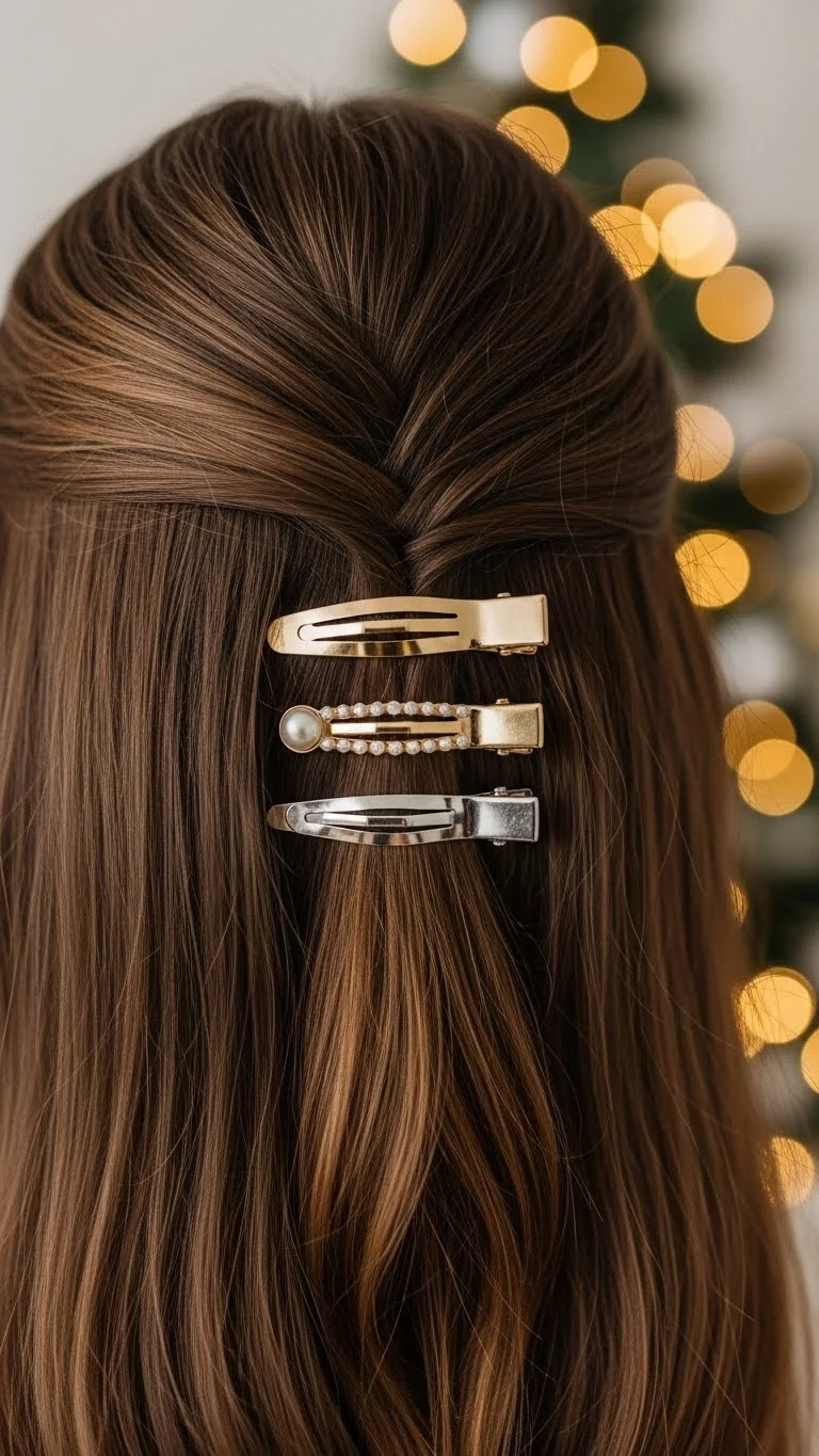 A stacked barrette look takes seconds. Create a deep side part. Place two or three barrettes in a row. Use gold, silver, or pearl. Discount shops often sell sets for cheap. Keep hair straight or wavy. This style works for short, medium, and long hair. It photographs well under party lights and stays comfortable all night.
