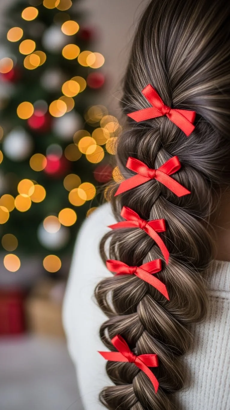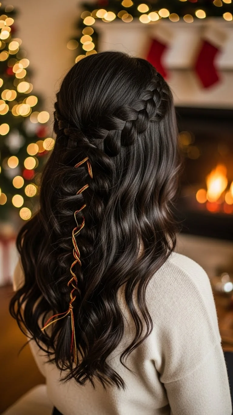A braid with ribbon feels playful and seasonal. Pick a satin ribbon in red, silver, or green. Tie it at the top, then braid through the length. Pull the braid slightly apart for a fuller shape. You don’t need perfect skill. This style looks better when a bit loose. Ribbons from craft stores cost very little and come in many colors. If your braid slips, add a light spritz of hairspray. To switch it up, braid only one side for a softer look. This works well for kids or adults.